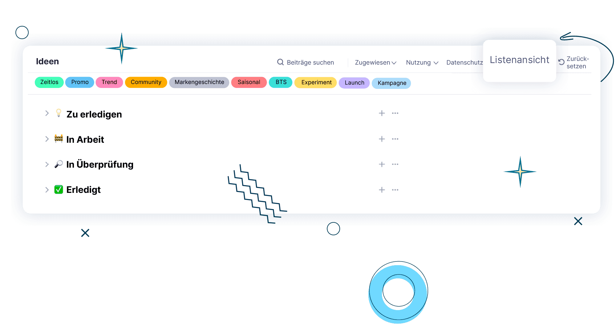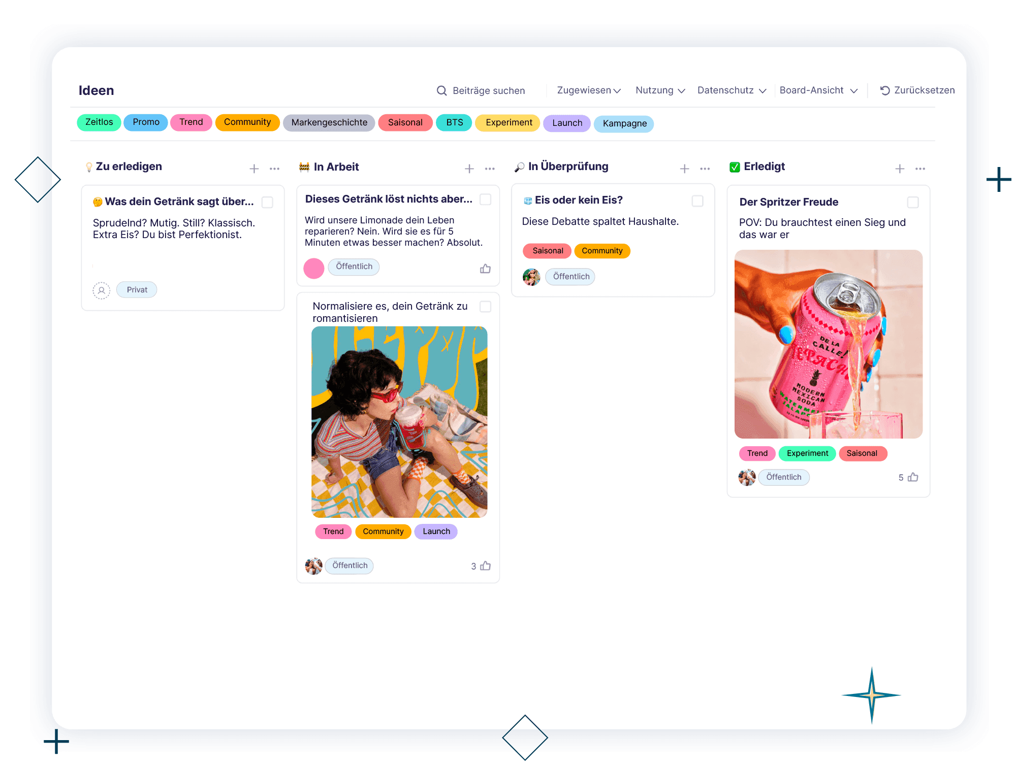 Ziehen Sie Ideen per Drag-and-Drop von „Idee“ zu „Bereit“ und sehen Sie den Fortschritt auf einen Blick. Ideal, um zu verfolgen, wie Ideen vorankommen.