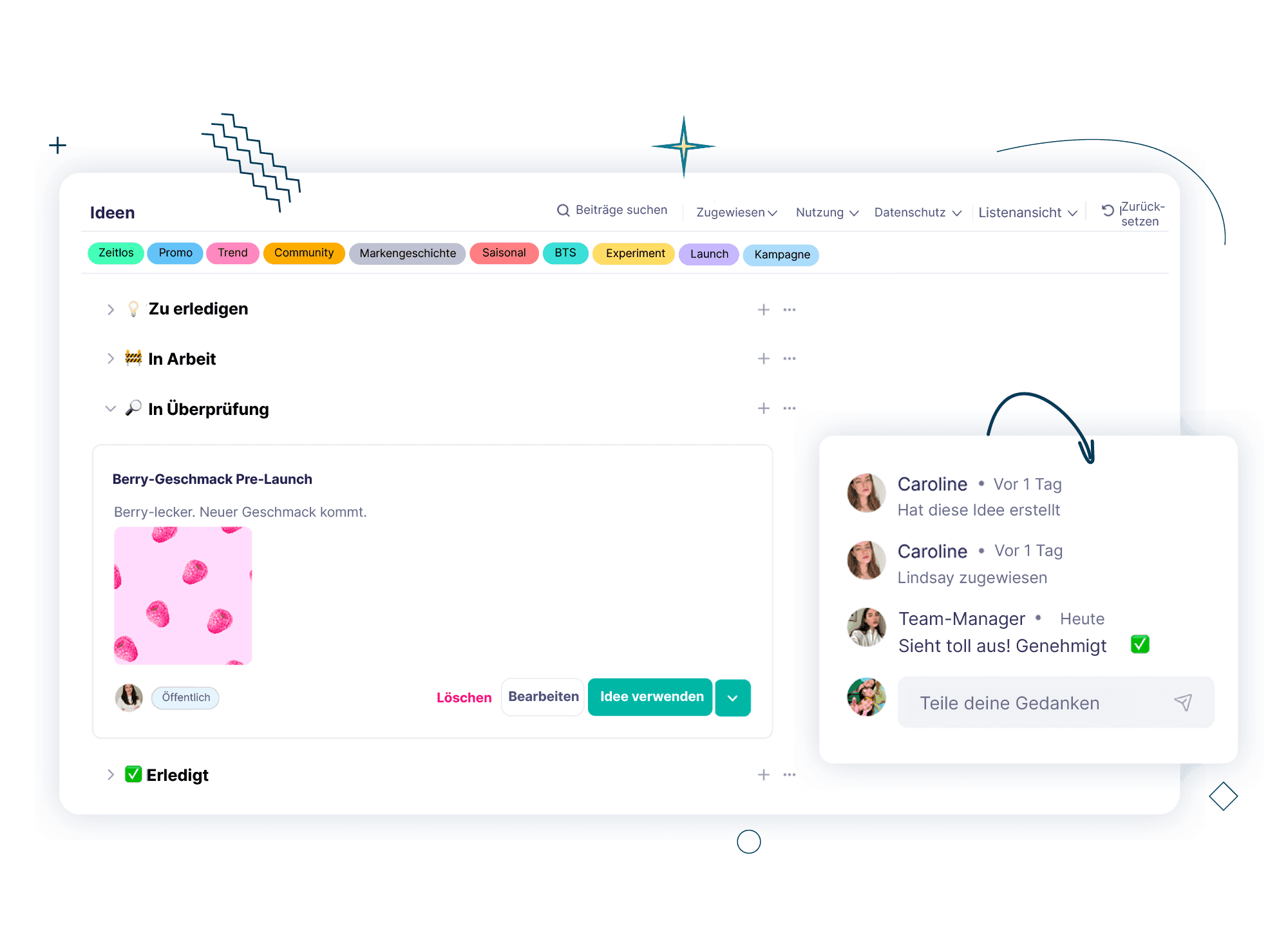 Ja. Sie können Ideen zuweisen, Notizen hinterlassen und klare Genehmigungen einholen, was die Planung von Inhalten mit Teamkollegen oder Kunden erleichtert.