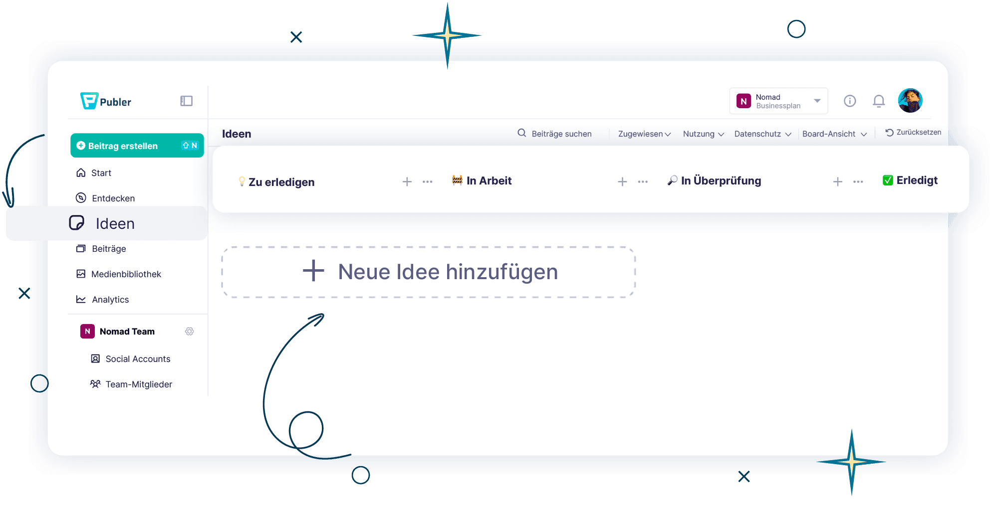 Publer Ideas ist ein Raum zur Planung von Inhalten, in dem Sie Social-Media-Ideen erfassen, organisieren und gestalten, bevor sie geplant werden.