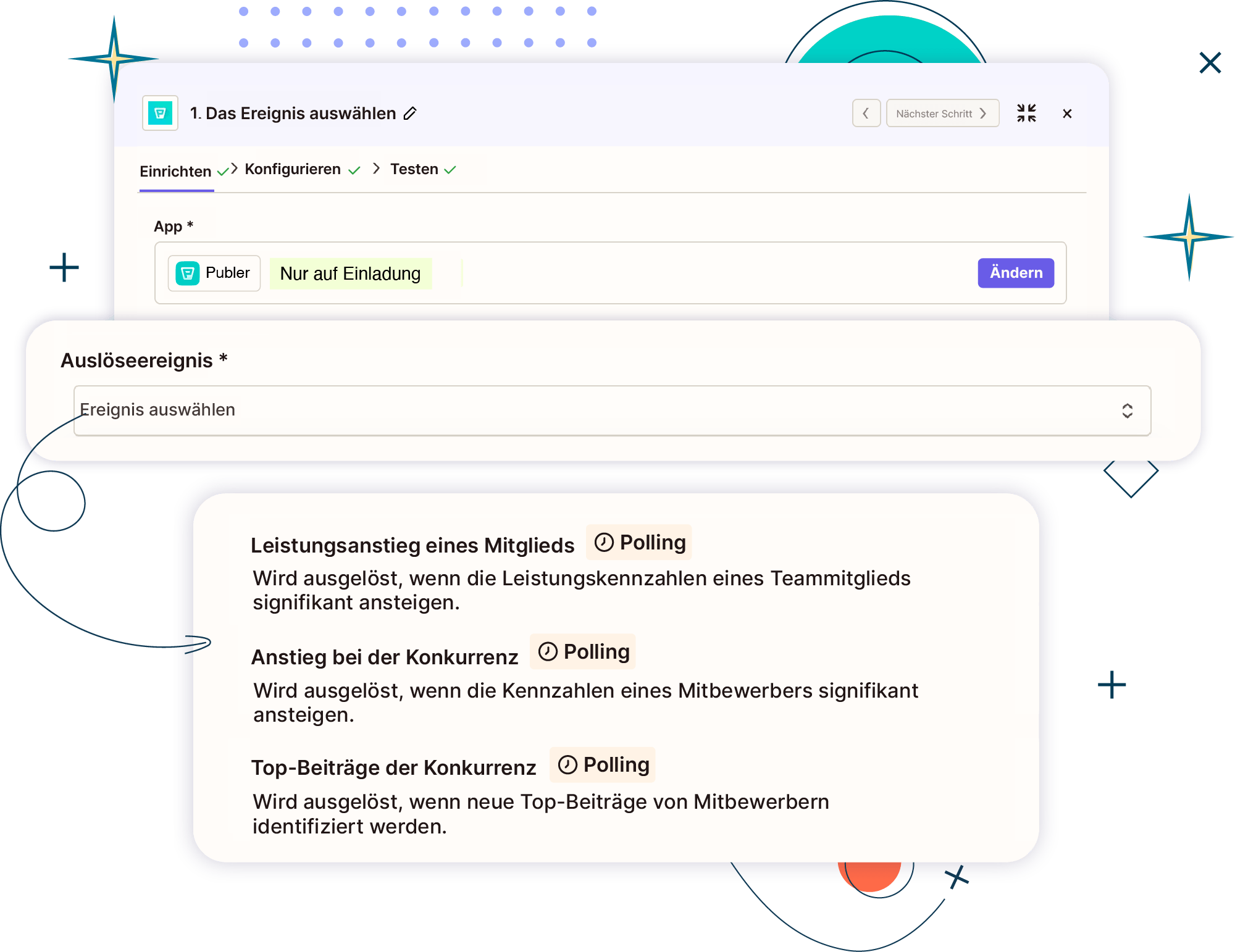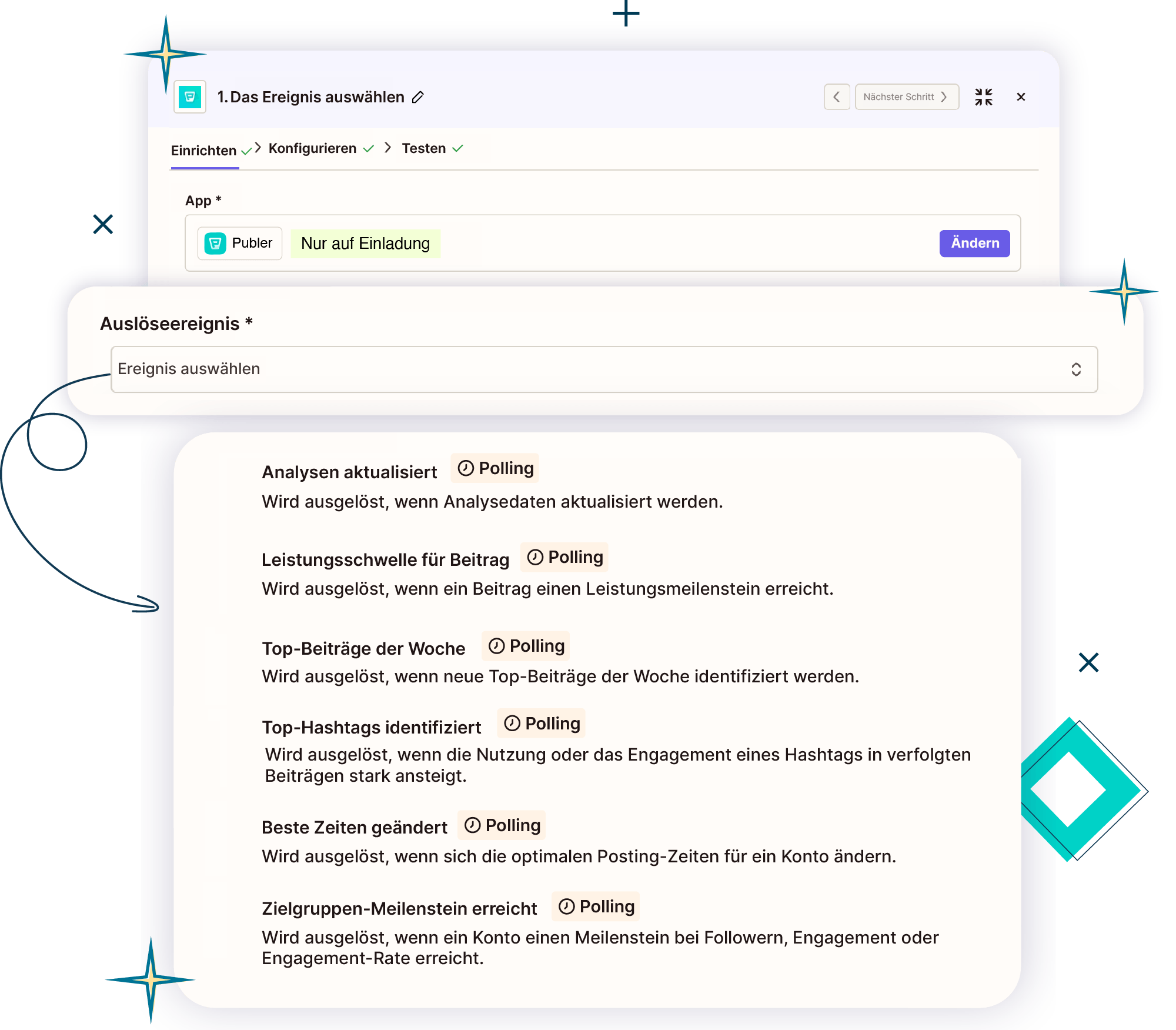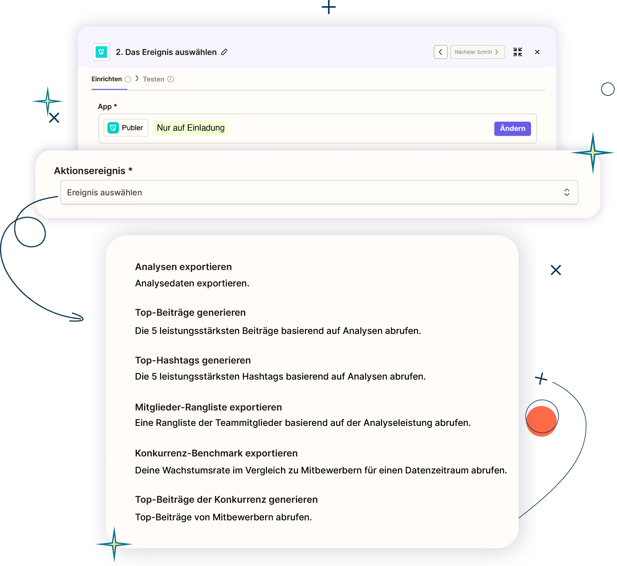 Absolut. Mit der Publer × Zapier-Integration können Sie: Analytics-Berichte automatisch exportieren Top-Posts oder Hashtag-Berichte generieren Zielgruppen-Meilensteine verfolgen Auf Leistungsschwellen reagieren Änderungen der besten Posting-Zeiten überwachen