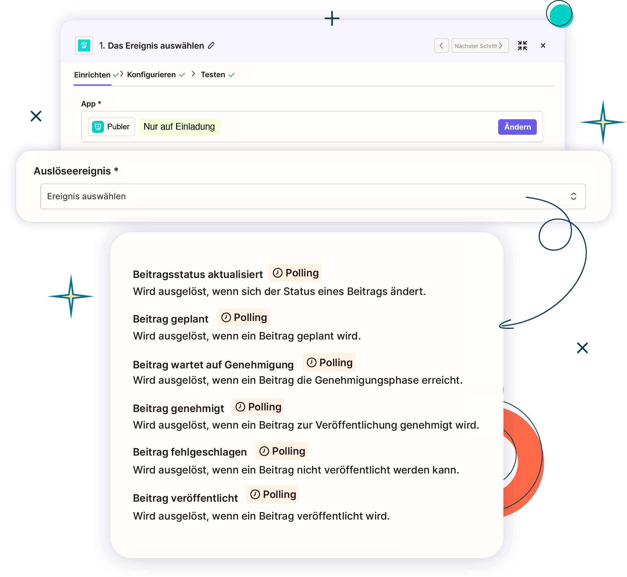 Natürlich. Sie können genehmigungsbasierte Workflows mit Triggern wie: Post wartet auf Genehmigung Post genehmigt Post geplant Post veröffentlicht oder fehlgeschlagen automatisieren. Zum Beispiel können Sie einen Beitrag automatisch veröffentlichen, sobald er genehmigt wird, oder Ihr Team benachrichtigen, wenn ein Beitrag nicht veröffentlicht wird.