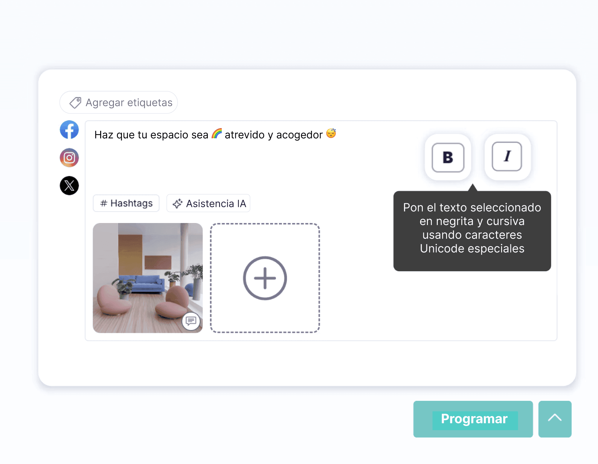 A diferencia de otras herramientas de extensión para compartir en redes sociales, la extensión de Publer ofrece un mini-editor todo en uno. Puedes dar formato al texto, programar posts, añadir comentarios de seguimiento e incluso generar hashtags, sin salir de la página en la que te encuentras.