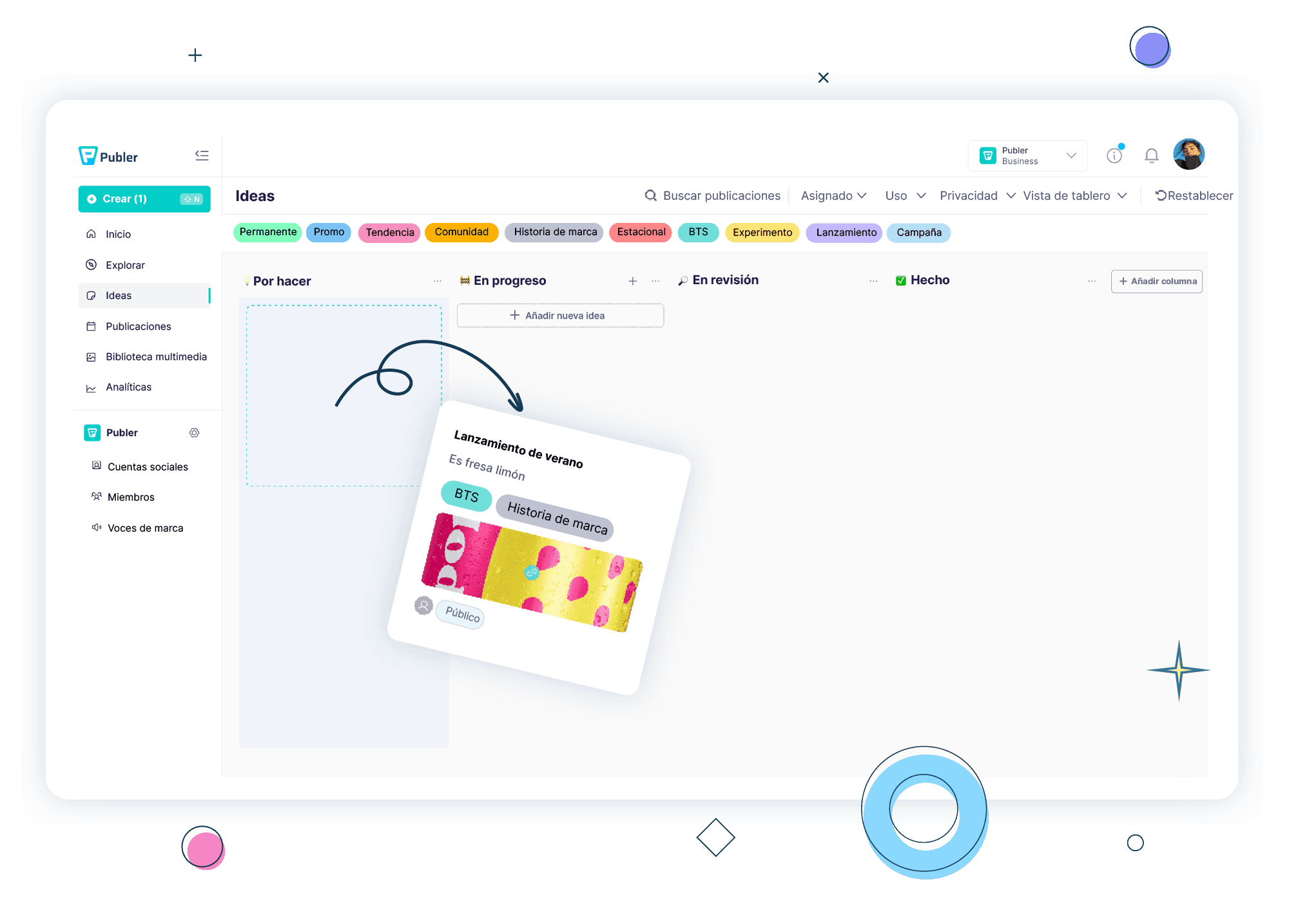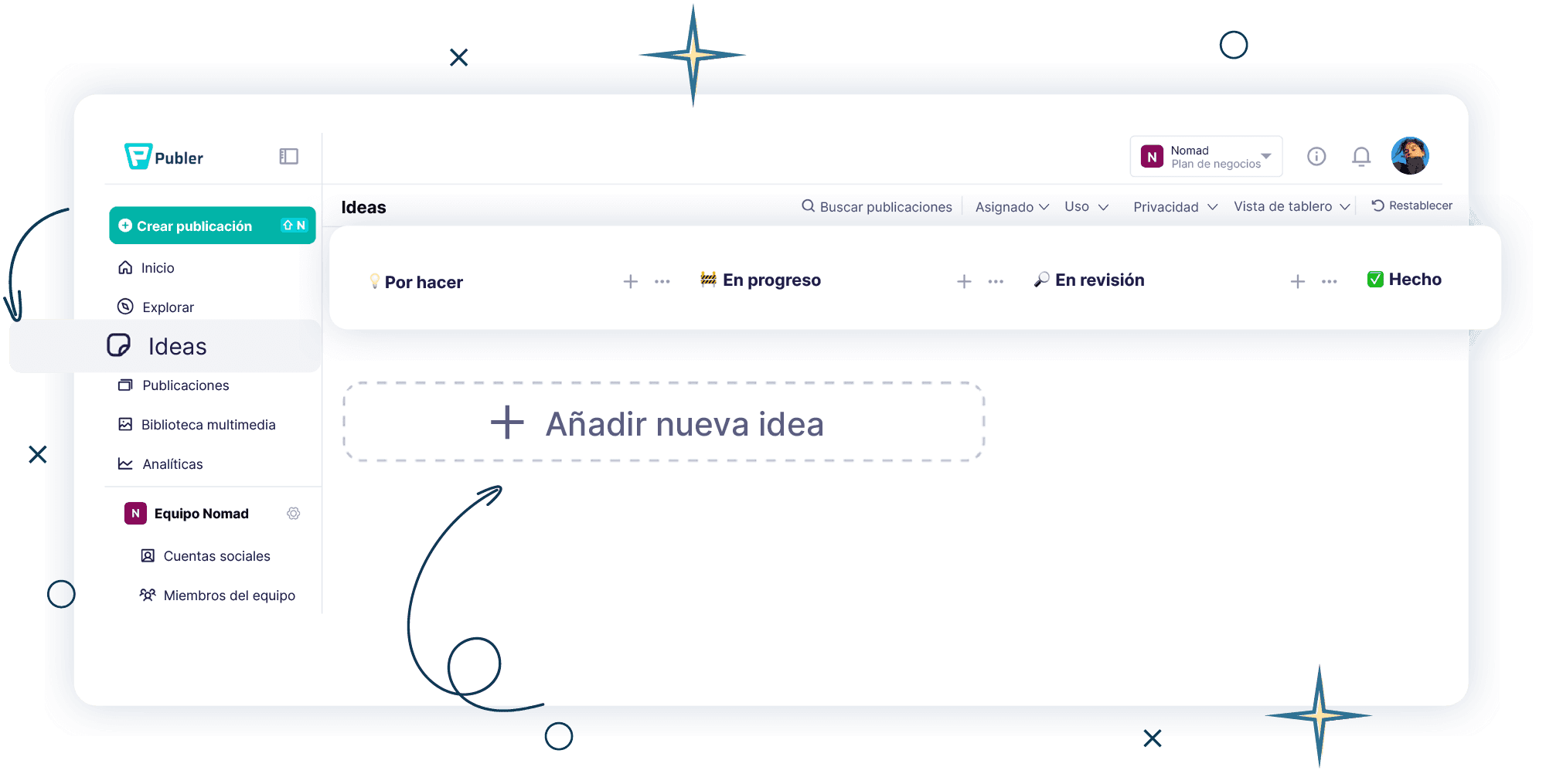 Publer Ideas es un espacio de planificación de contenido donde capturas, organizas y das forma a las ideas para redes sociales antes de que se programen.