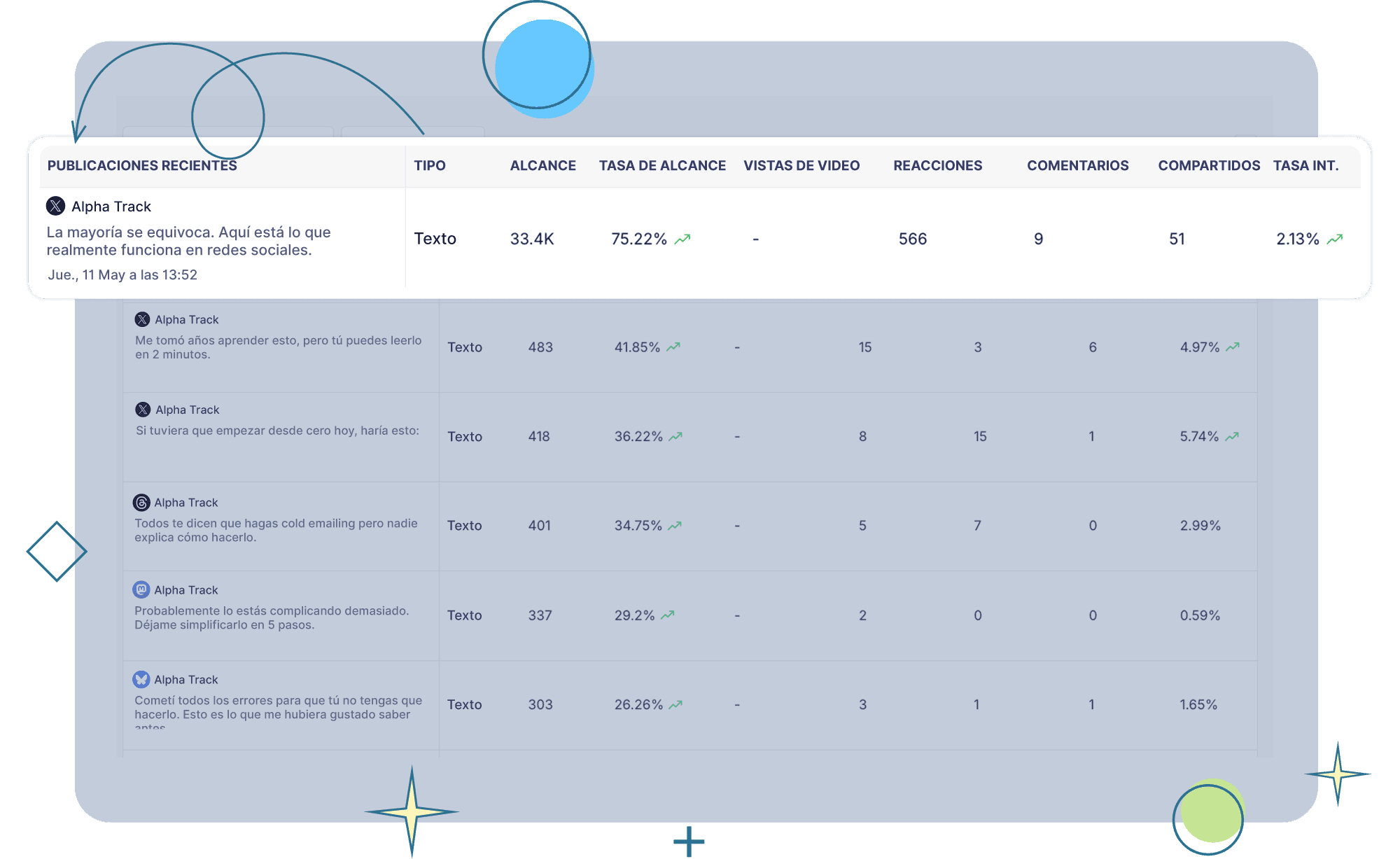 Obtén información detallada sobre el rendimiento de tus hilos en todas las plataformas. Alcance, me gusta, tasa de compromiso y más.