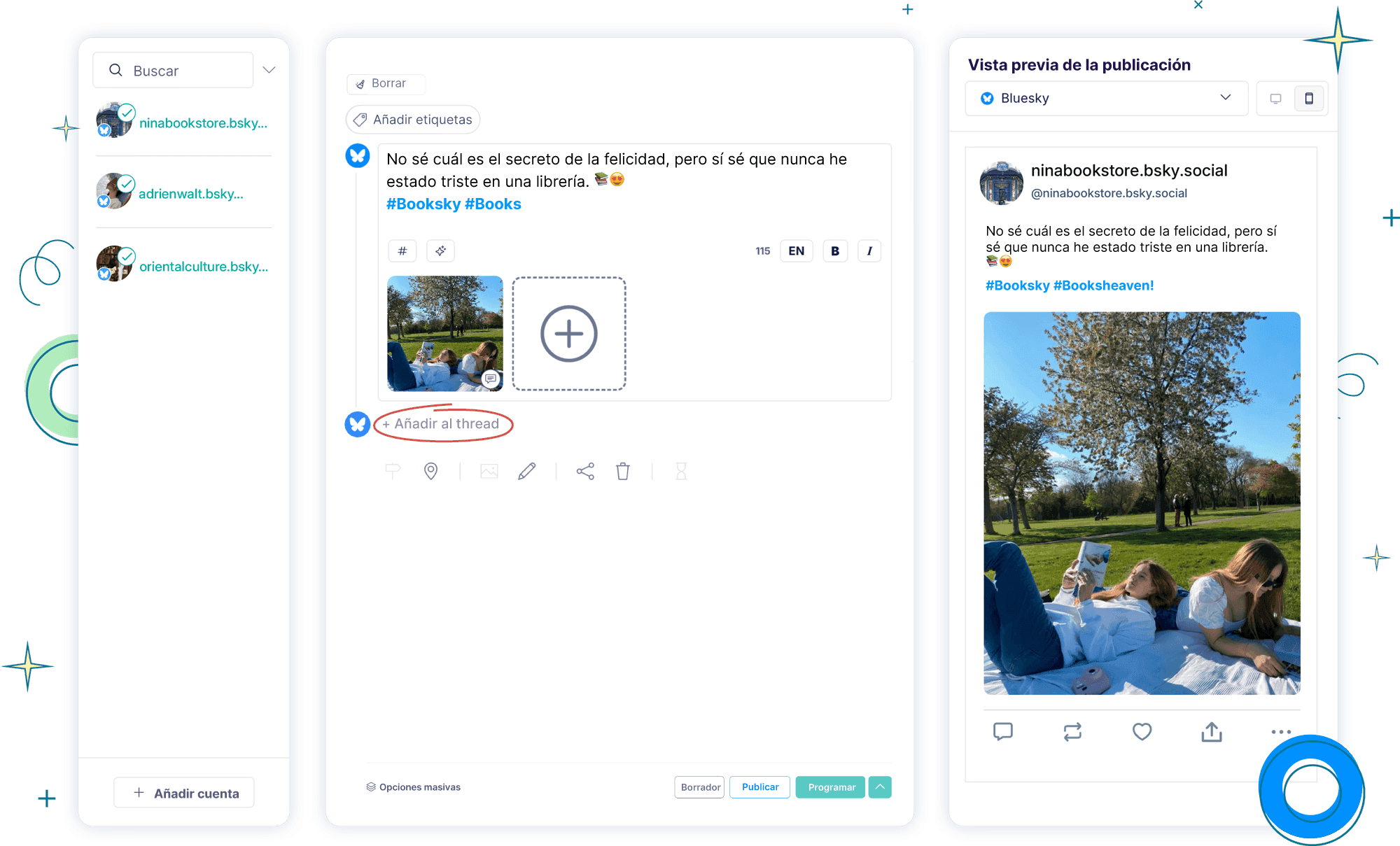 ¿Necesitas compartir una historia más profunda? Crea y programa hilos de Bluesky para ofrecer contenido atractivo y extenso que cautive a tu audiencia. Reutiliza tus hilos en X (Twitter), Threads y Mastodon.