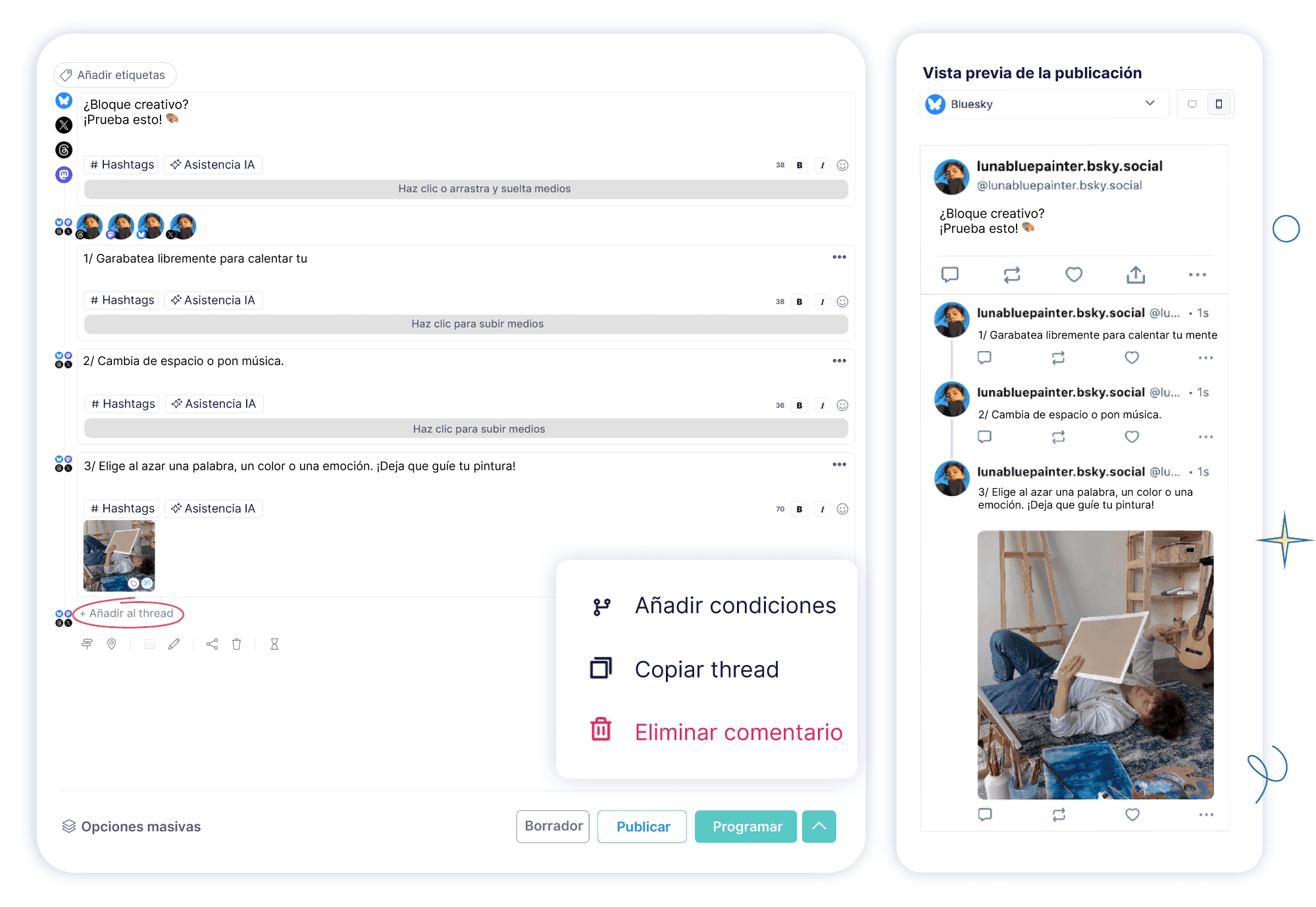 ¿Necesitas compartir una historia más profunda? Crea y programa hilos de Bluesky y publica simultáneamente en X (Twitter), Threads y Mastodon.
