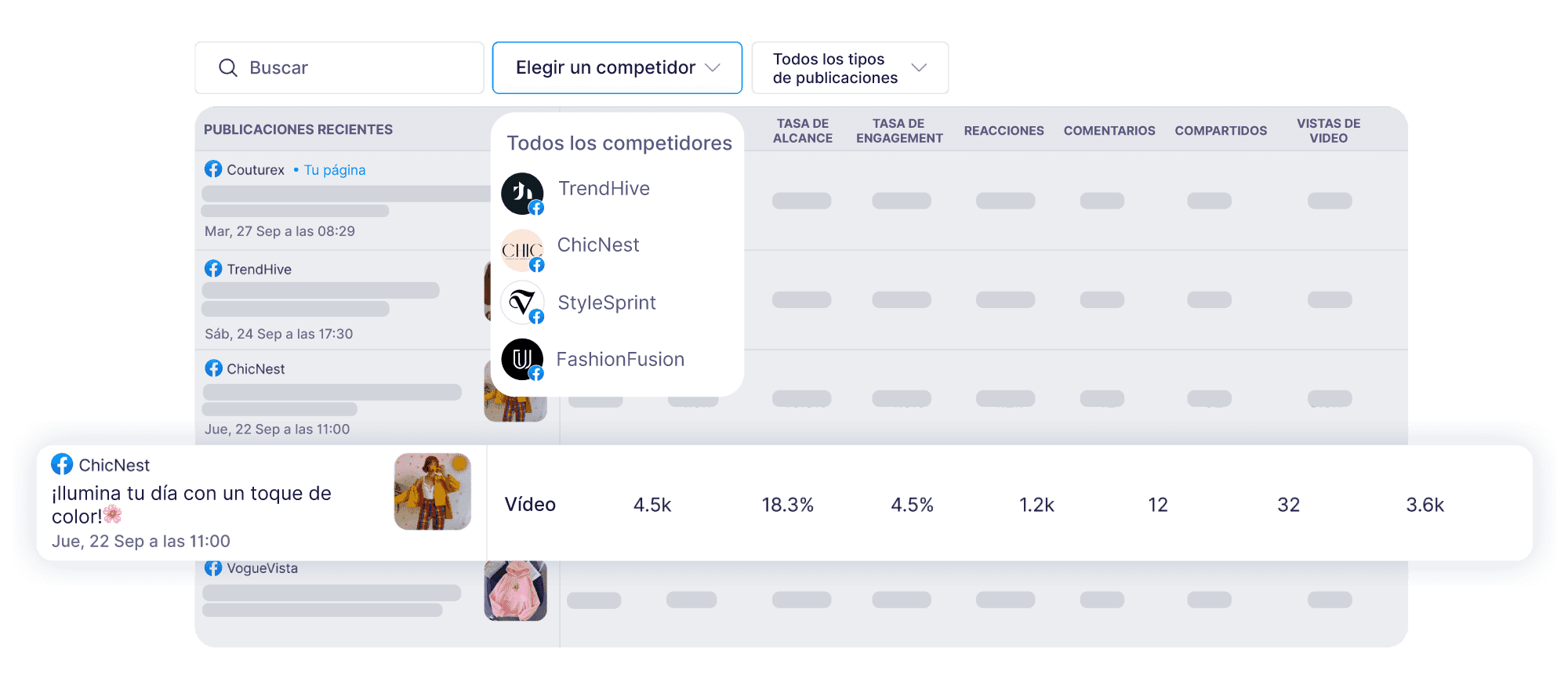 Compara tu estrategia de contenido en Facebook con la de tus competidores: analiza tasa de engagement, crecimiento, publicaciones de mayor rendimiento y hashtags más efectivos. Identifica oportunidades clave para ampliar tu alcance y multiplicar la interacción en Facebook.
