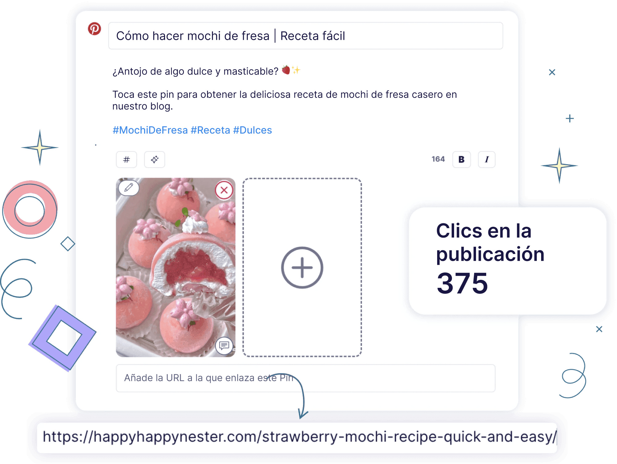 Cada Pin es una oportunidad para atraer clics a tu sitio web. Enlaza tu contenido con URLs optimizadas de Pinterest y mide los resultados con sus analíticas de tráfico.