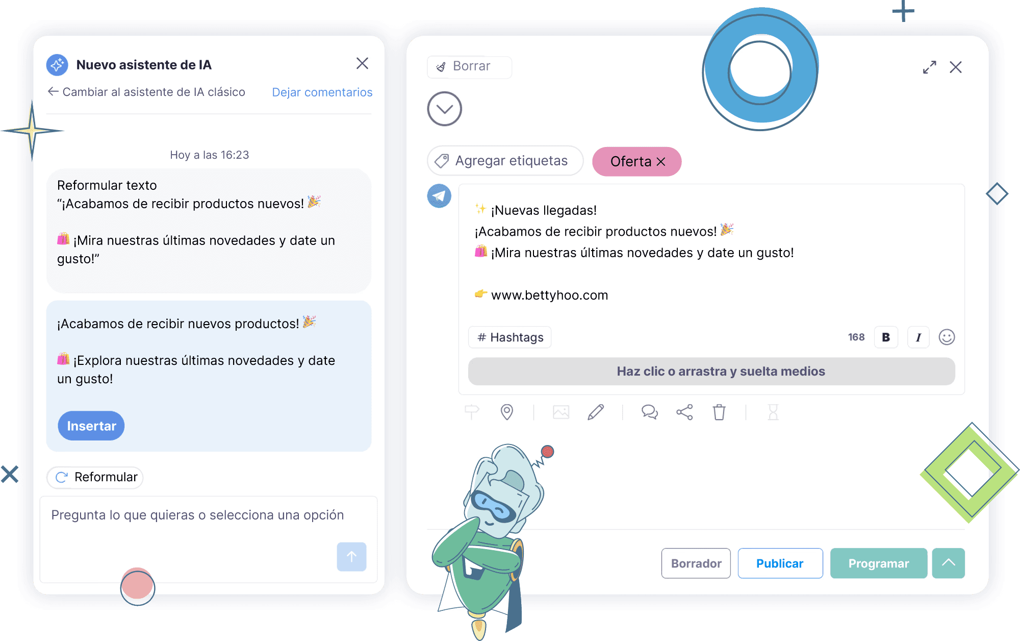 ¡Genera posts atractivos en Telegram con IA en segundos! Las herramientas de IA de Publer ayudan a crear contenido, sugerir ideas y personalizar el tono y estilo para que coincida con tu marca.