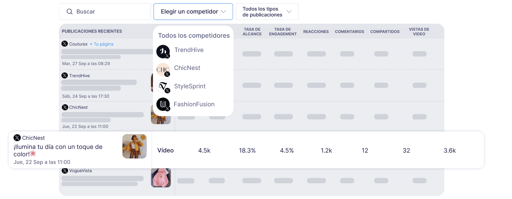 Con la herramienta de análisis de la competencia de Publer, puedes monitorear la interacción de tus competidores, el rendimiento de sus hashtags y los horarios de publicación para mejorar tu estrategia.