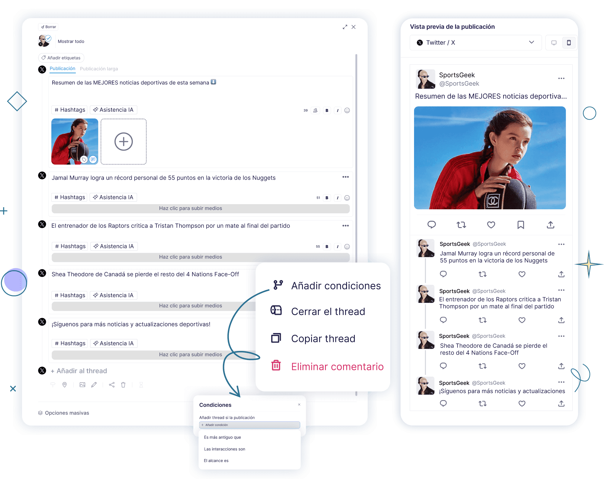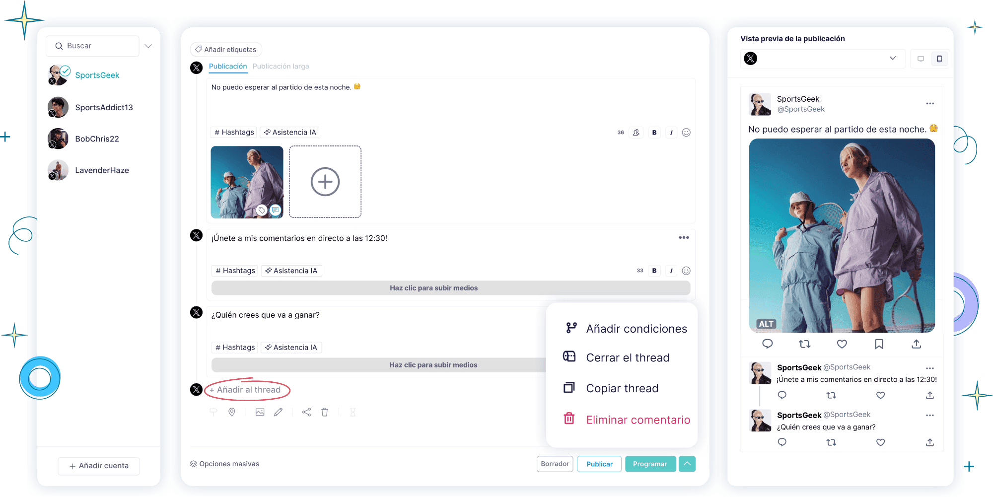 Crea hilos de 26 tuits. Activa seguimientos mediante el engagement, el alcance o el momento, y envuelve el hilo para máxima visibilidad.