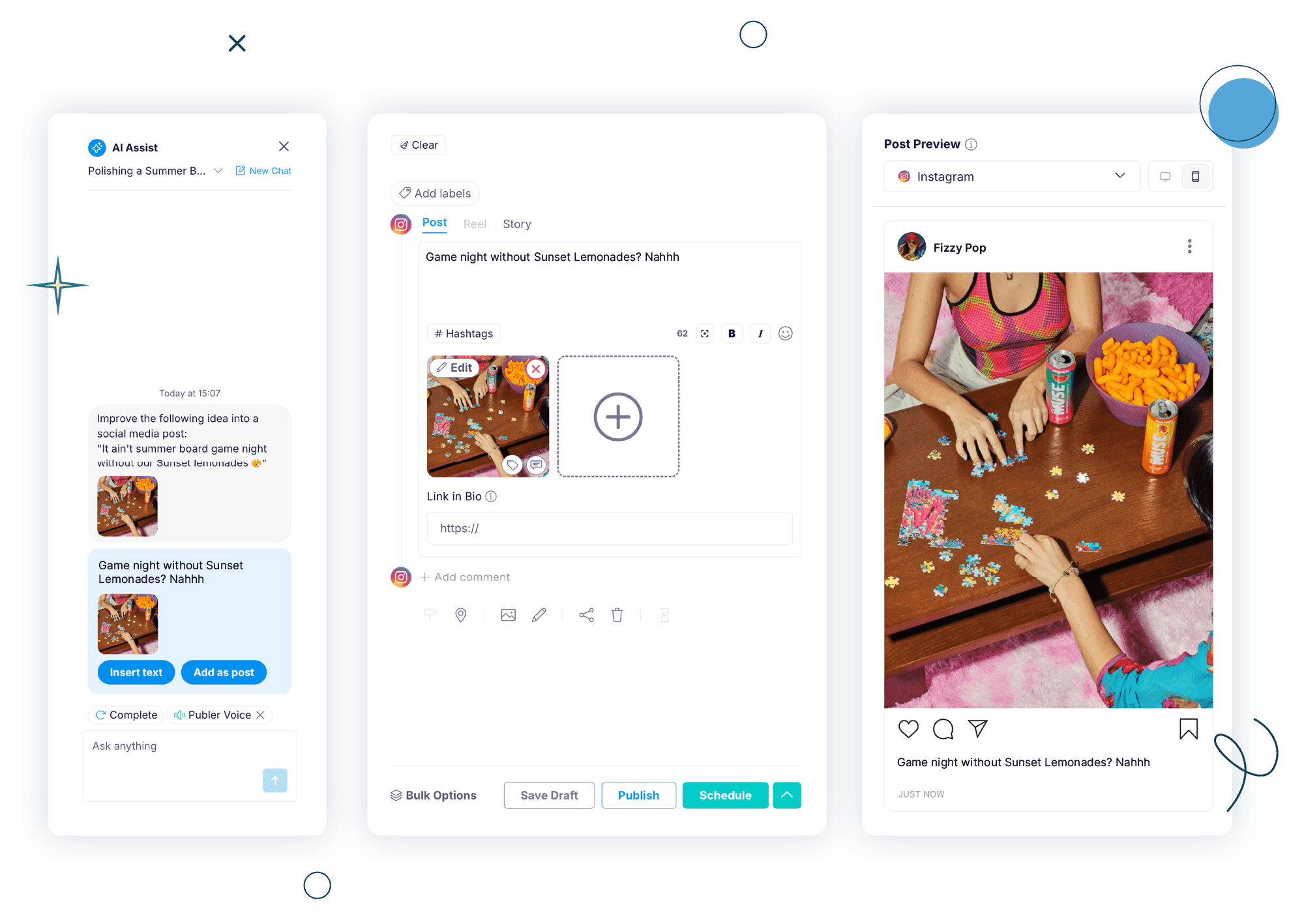 When an idea is ready, you can use AI to turn it into a publish-ready social media post, helping you move from concept to execution faster.