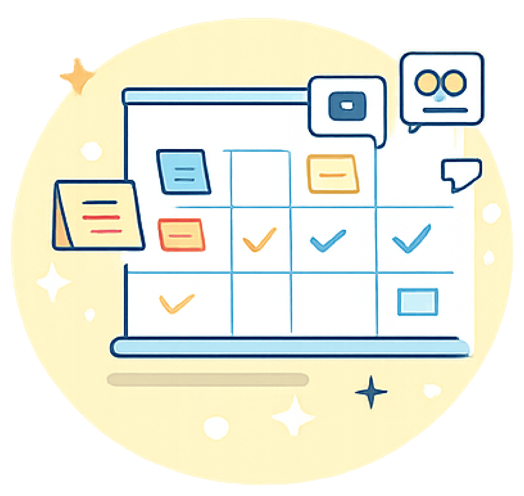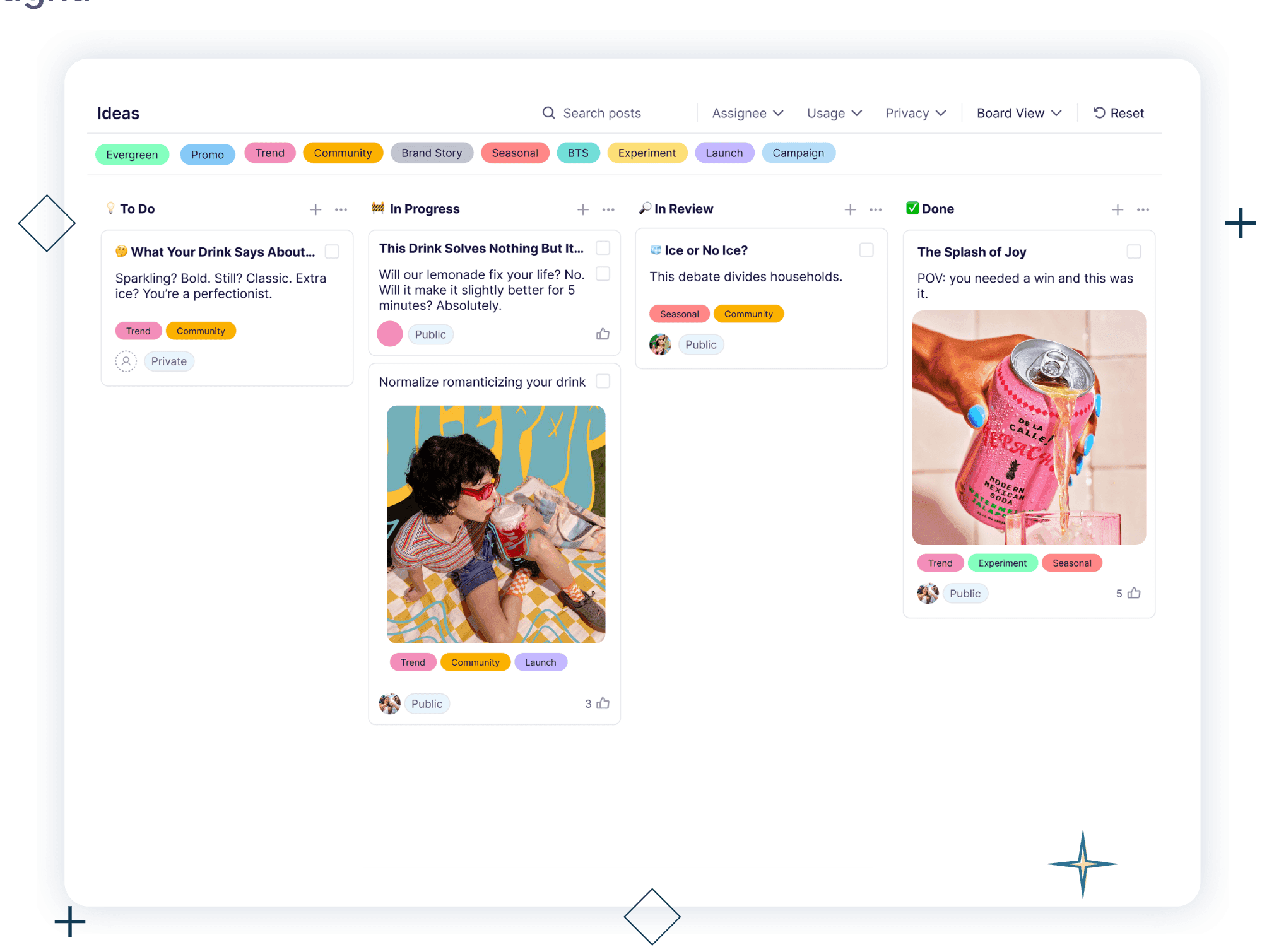 Drag and drop ideas from “idea” to “ready” and see progress at a glance. Ideal for tracking how ideas move forward.