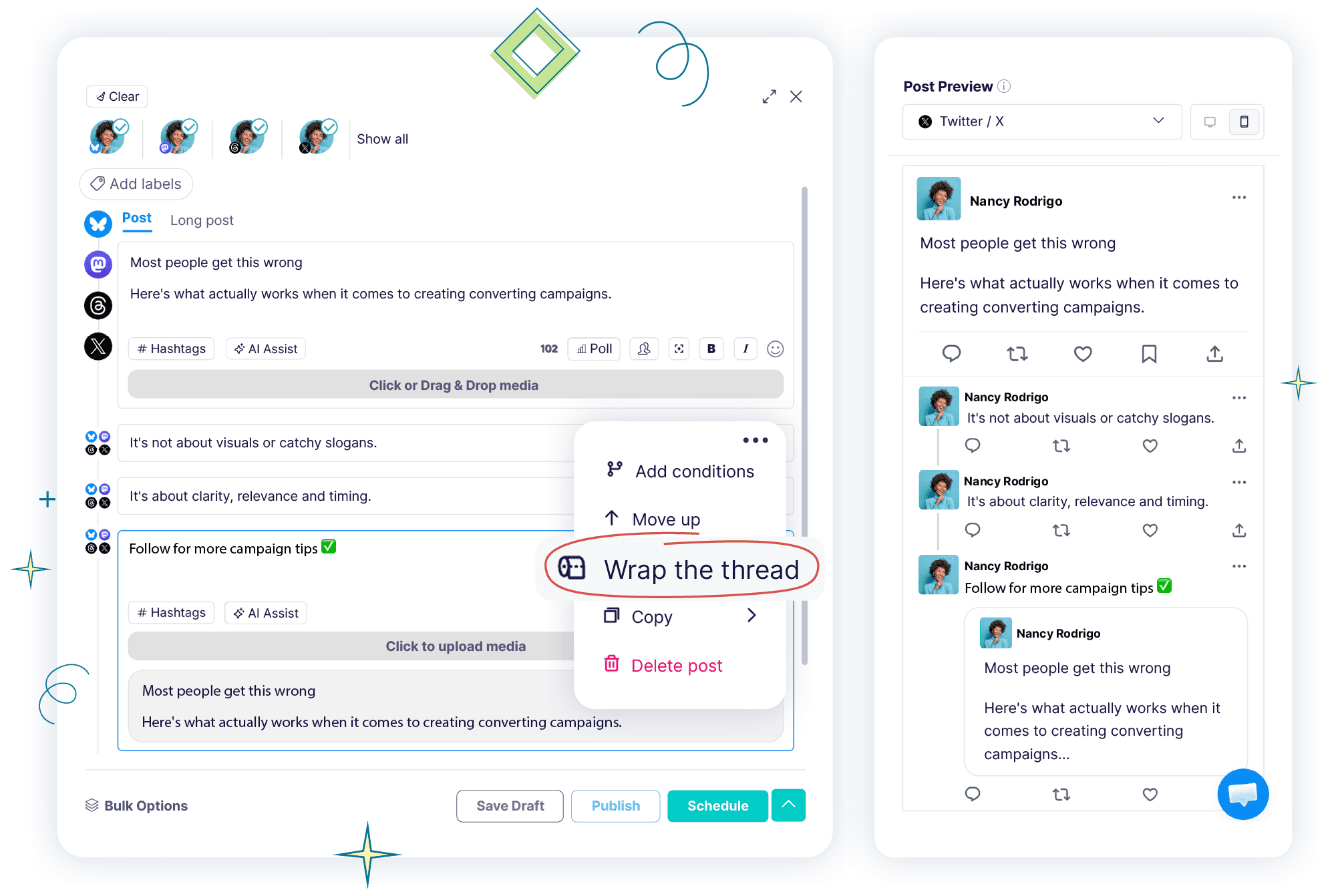 You can compose and schedule threads for X (formerly Twitter), Threads, Mastodon, and Bluesky, all from one dashboard.