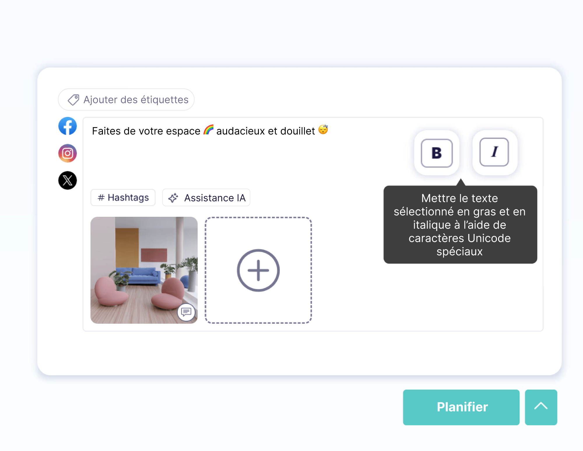 Contrairement à d’autres extensions de partage sur les réseaux sociaux, l’extension Publer dispose d'un mini éditeur tout-en-un. Tu peux formater ton texte, programmer tes publications, ajouter des commentaires de suivi, et même générer des hashtags, le tout sans quitter la page sur laquelle tu te trouves.
