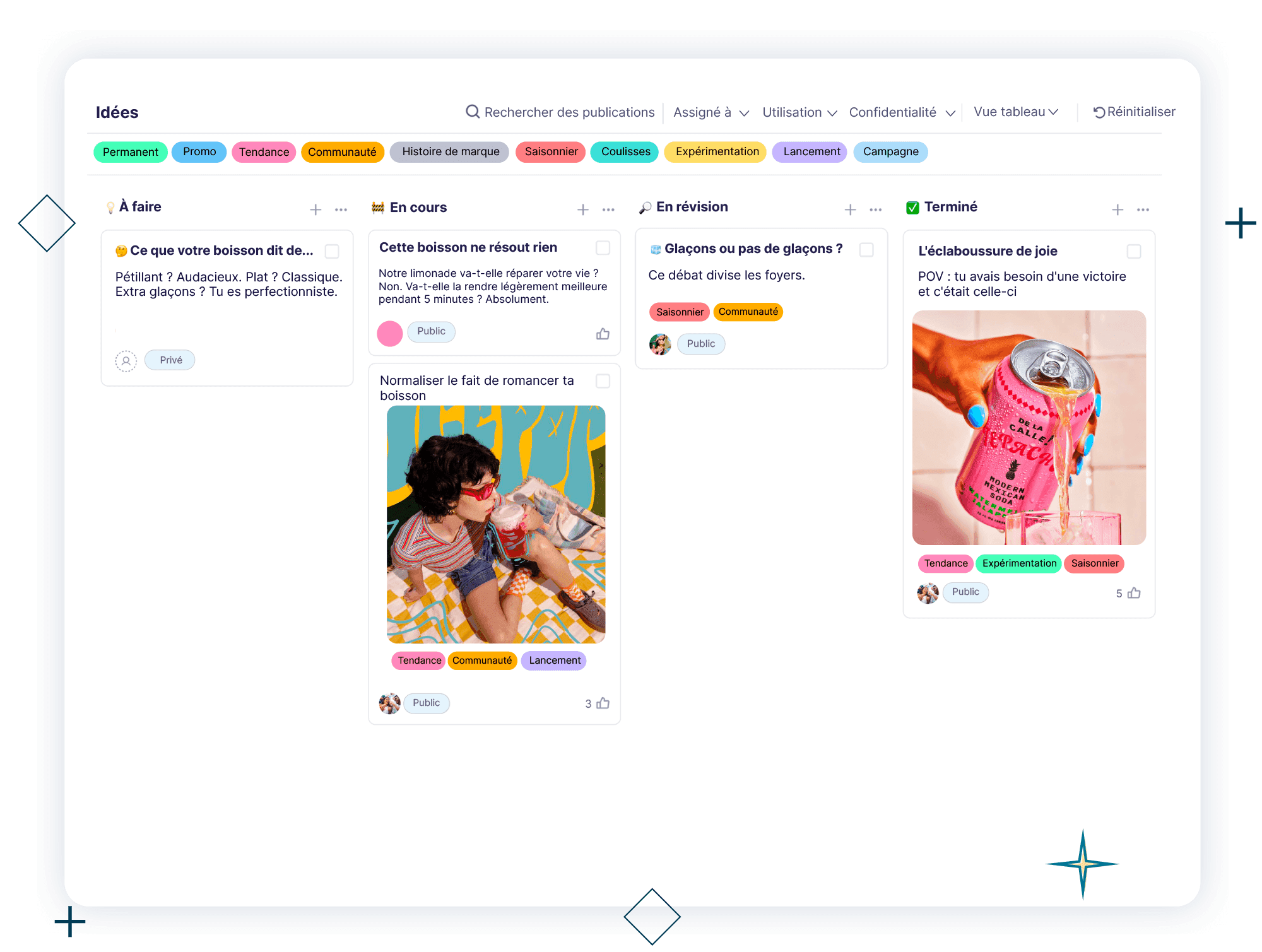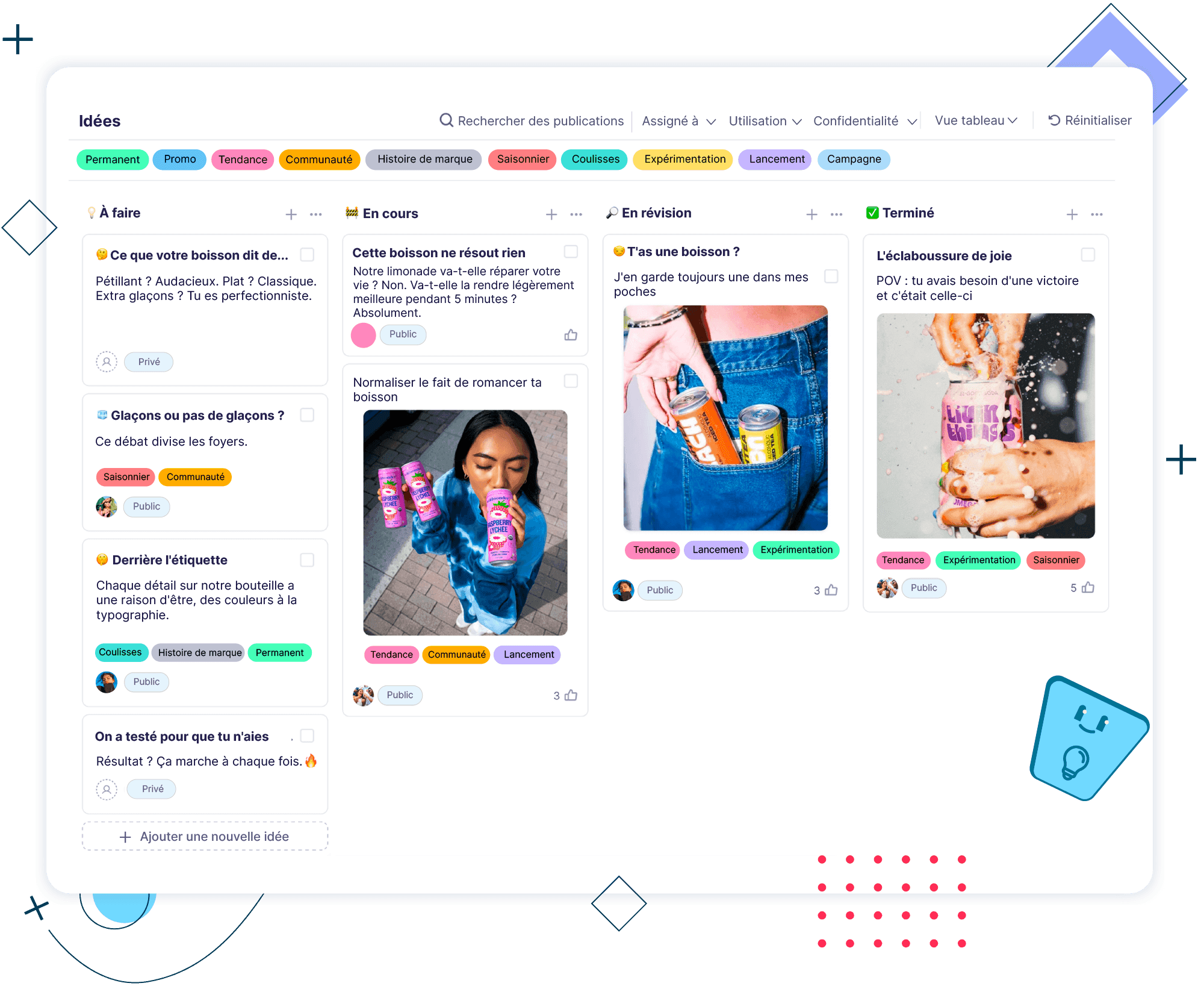 Glissez-déposez des idées de « idée » à « prêt » et voyez les progrès en un coup d'œil. Idéal pour suivre l'avancement des idées.