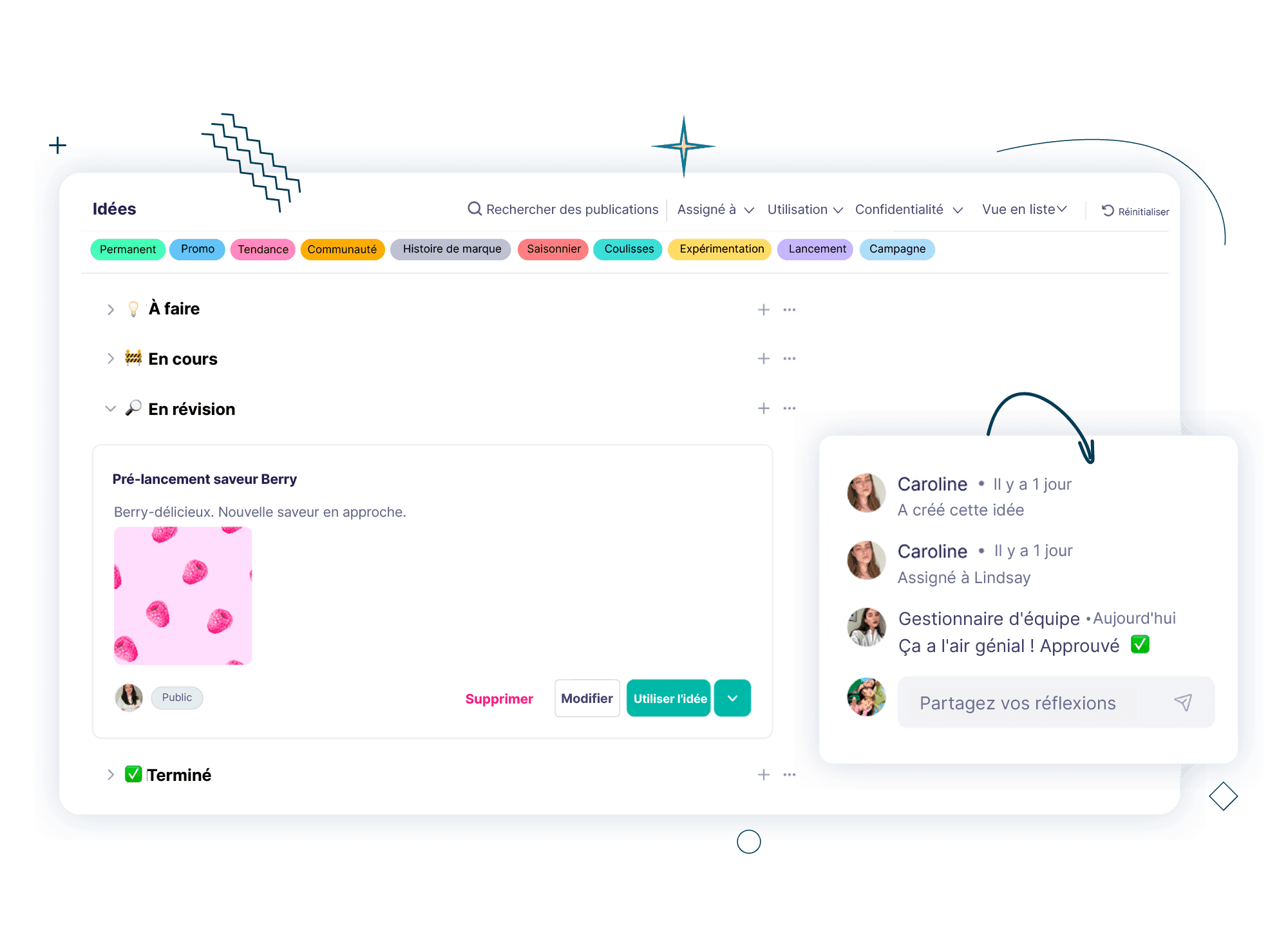 Oui. Vous pouvez attribuer des idées, laisser des notes et obtenir des approbations claires, ce qui facilite la planification de contenu avec des coéquipiers ou des clients.