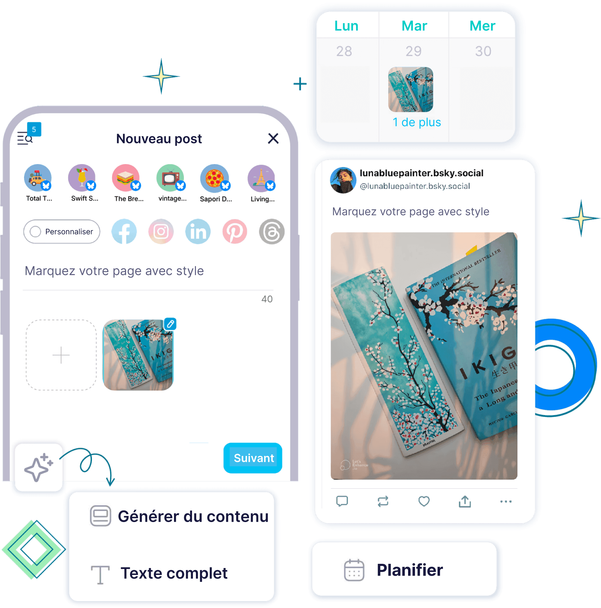Planifiez, créez et programmez facilement des publications, des fils de discussion et des vidéos sur Bluesky.
