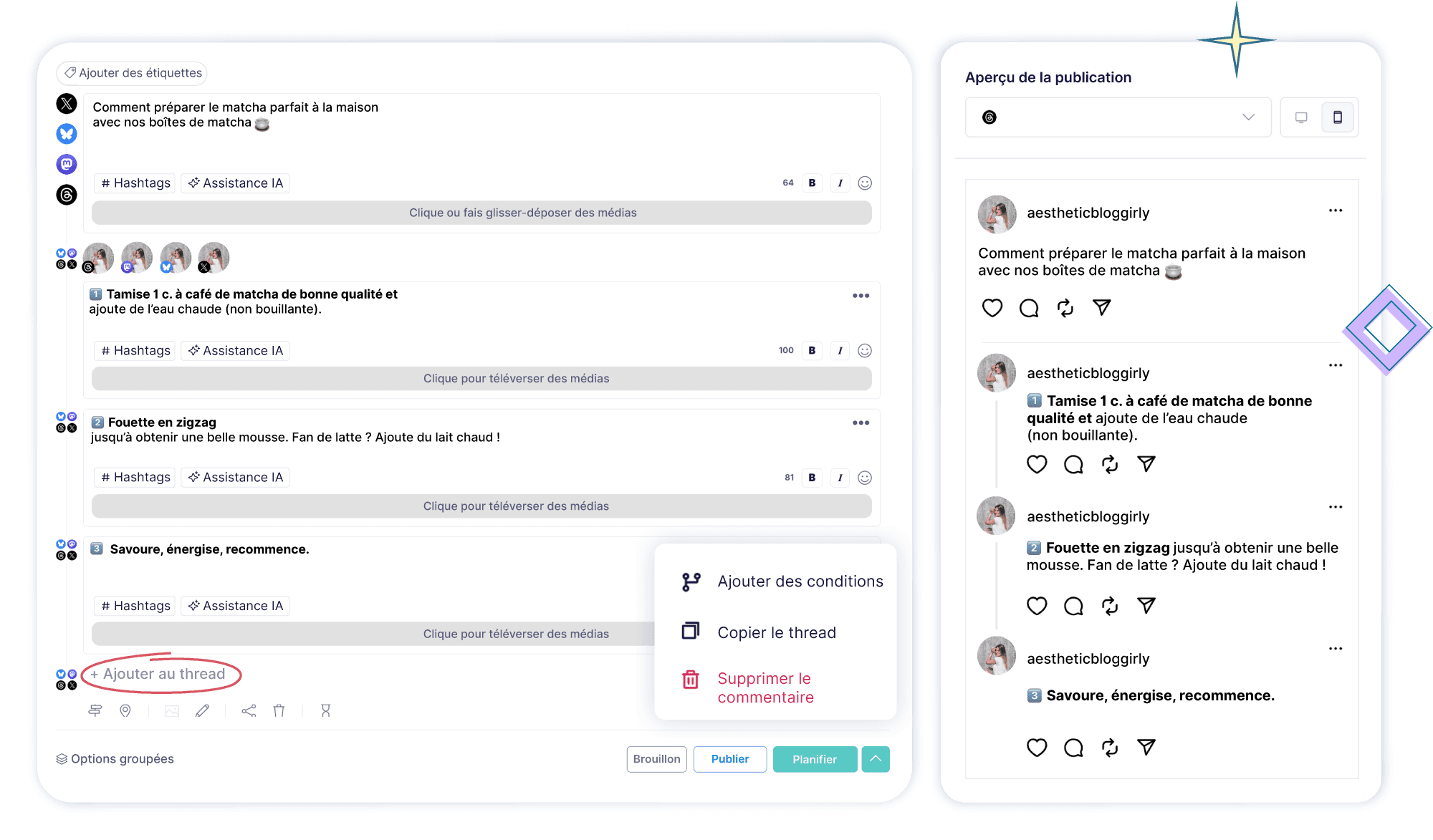 Conserve ton audience engagée en décomposant les idées en fils structurés et faciles à lire. Partage sans effort sur Twitter, Bluesky et Mastodon, le tout depuis Publer.