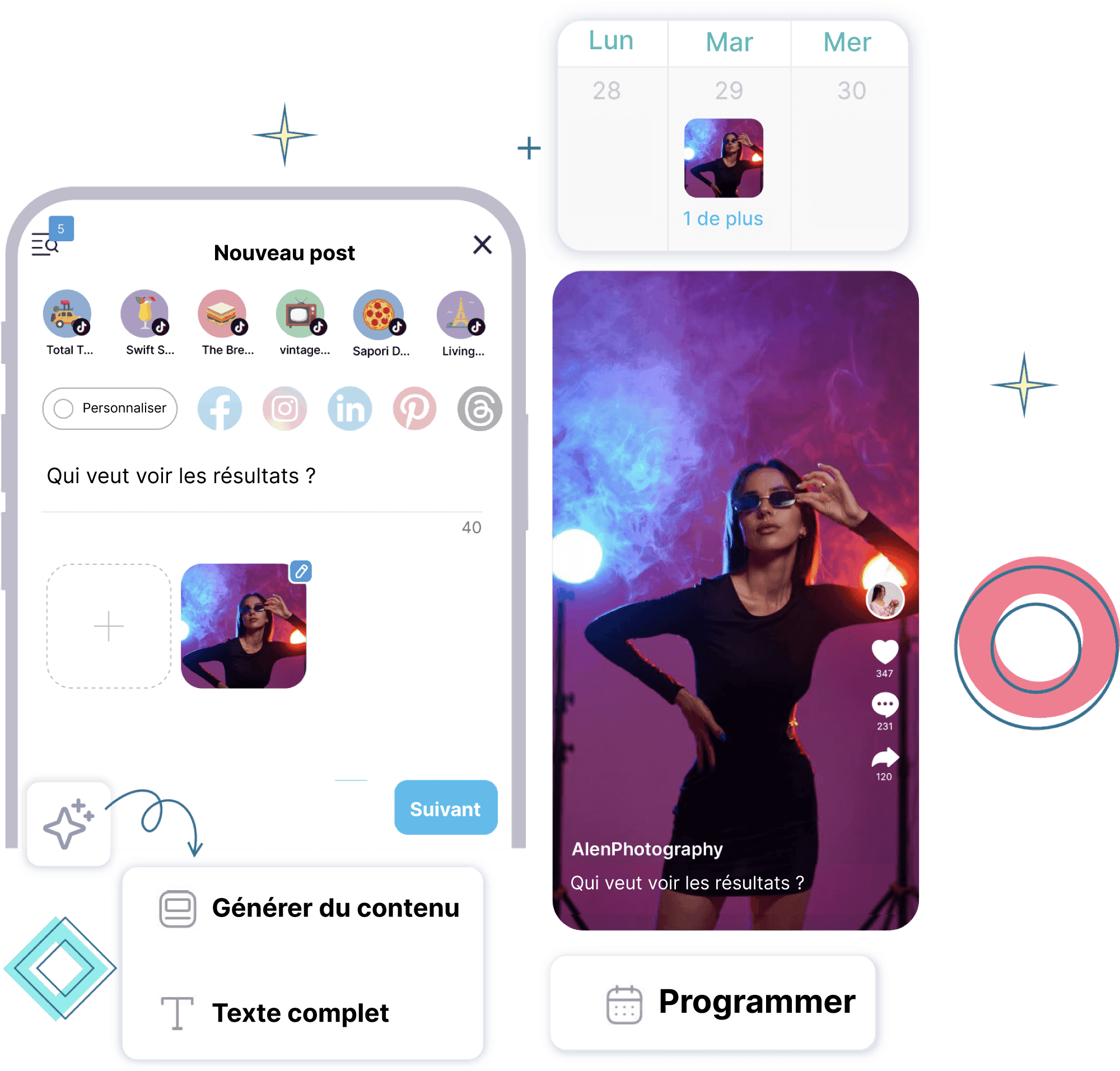 Oui ! Avec Publer, tu peux programmer tes publications sur TikTok et Instagram en même temps, ainsi que sur plus de 10 autres réseaux sociaux. Résultat : une présence fluide et cohérente sur toutes tes plateformes.