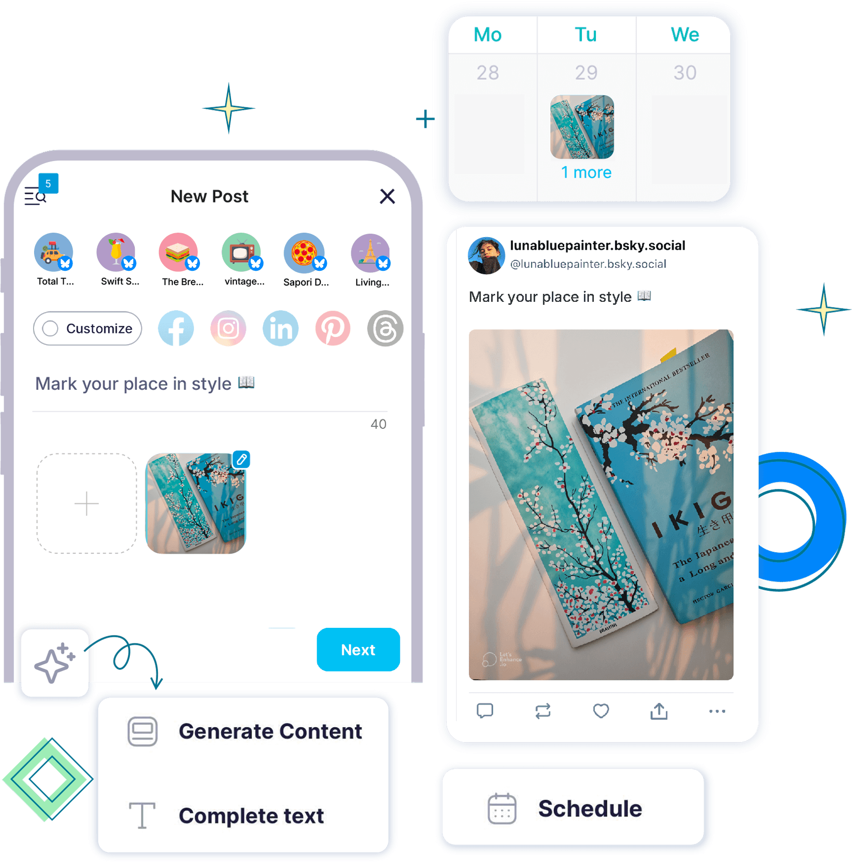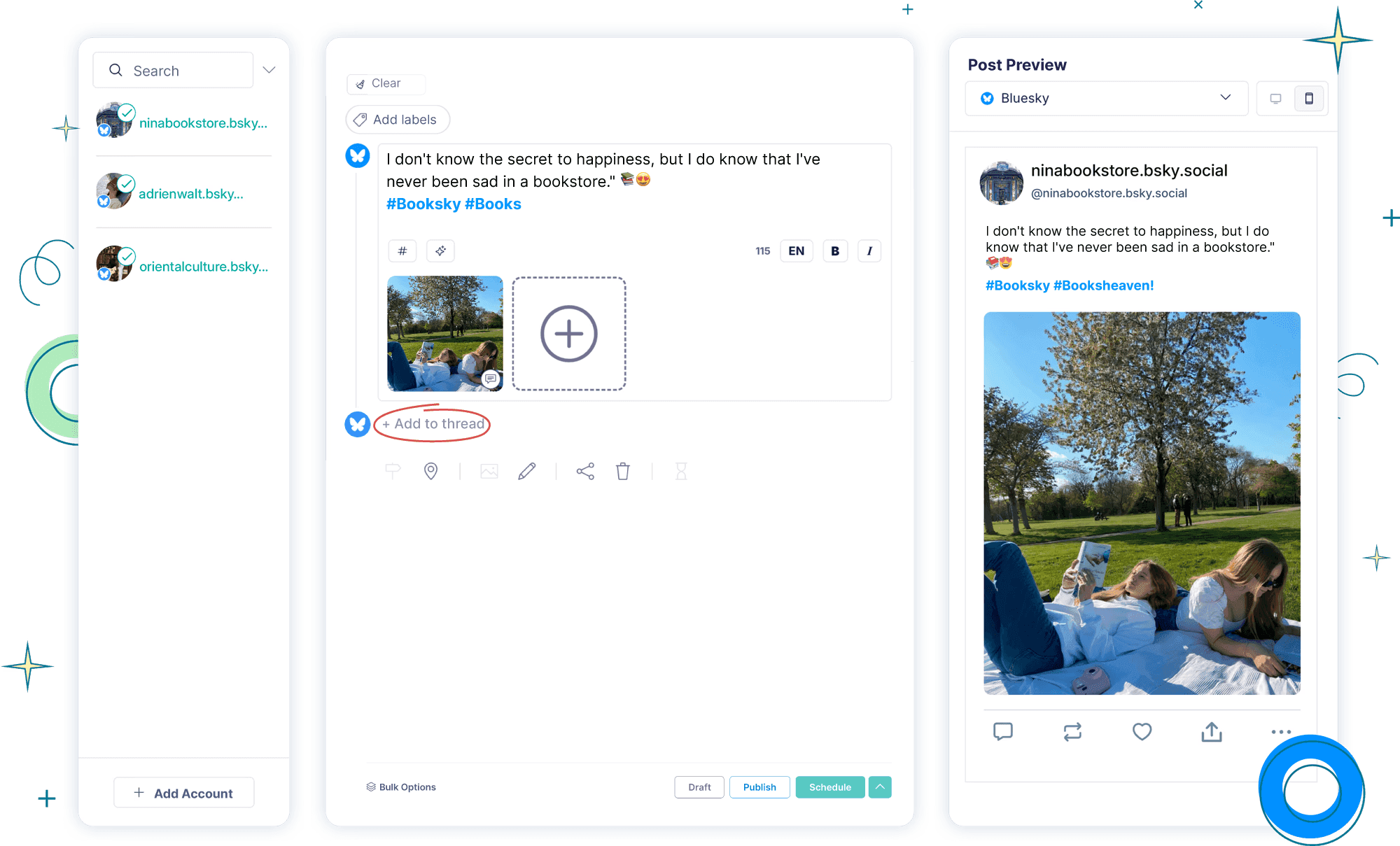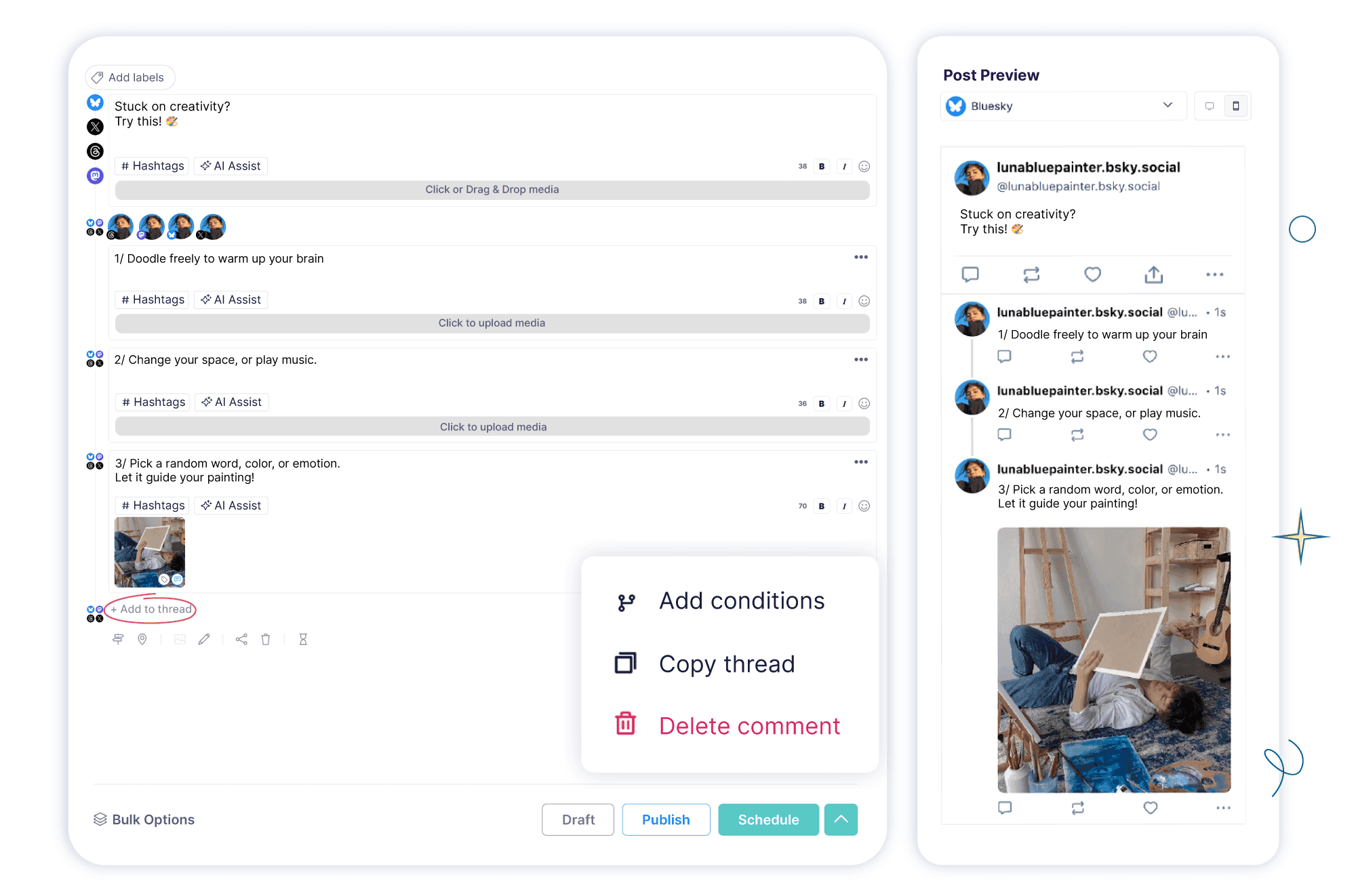 Need to share a deeper story? Craft and schedule Bluesky threads to deliver engaging, long-form content that captivates your audience. Repurpose your threads across X (Twitter), Threads, and Mastodon.