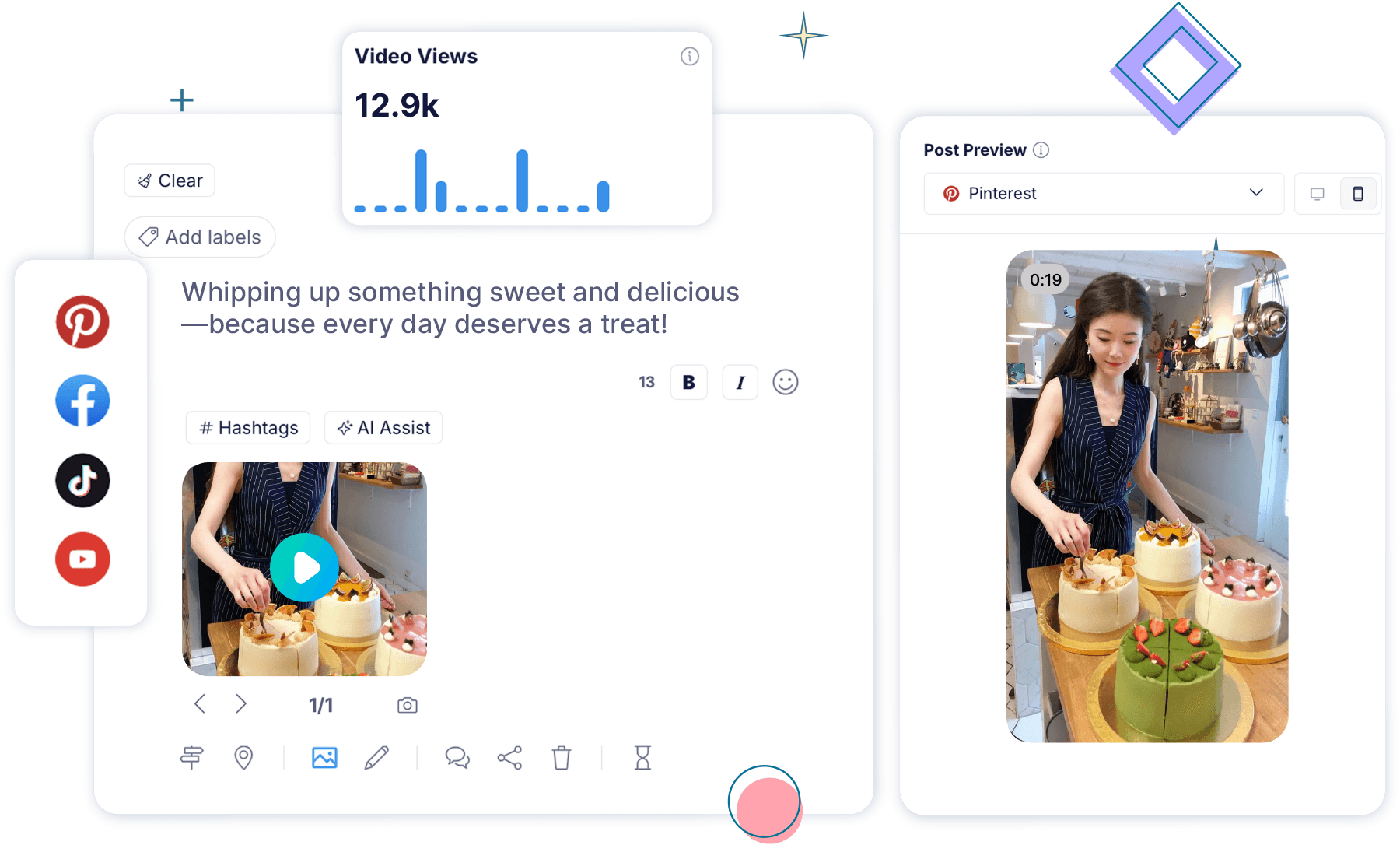 Plan and schedule Pinterest posts in advance, upload in bulk, and even automate posting with RSS feeds and AI assistance.