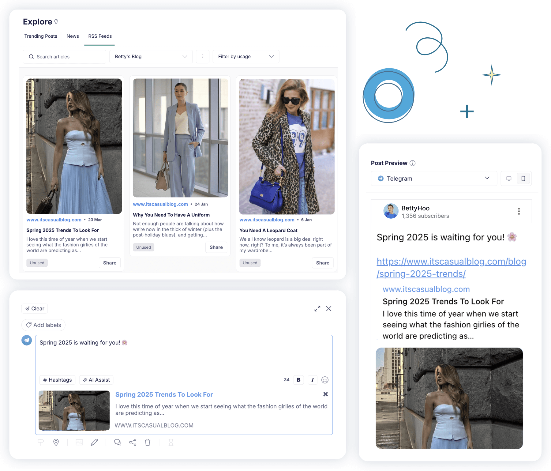 Automatically share updates from your blog to your Telegram using Publer’s RSS feed to Telegram integration.