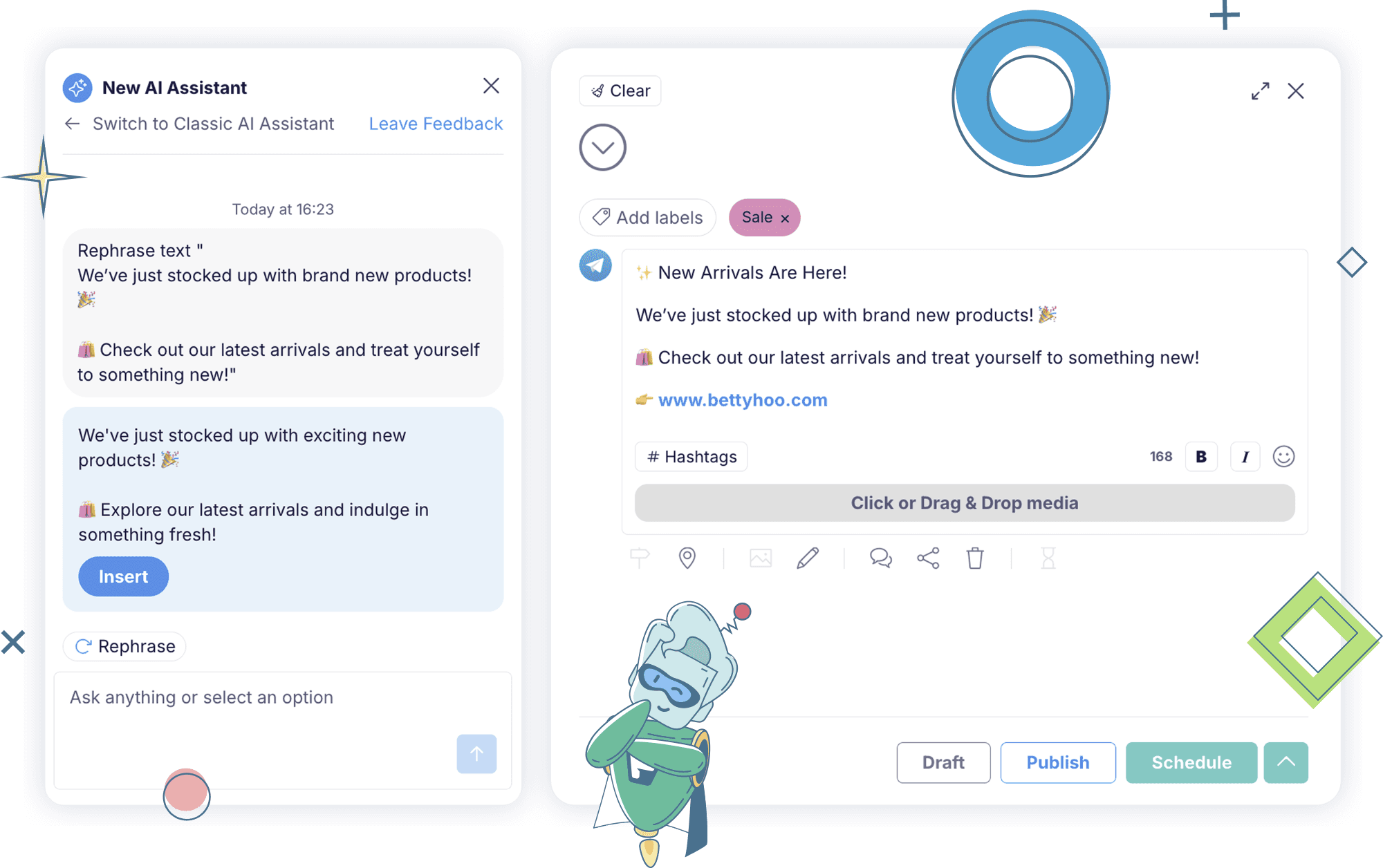 Generate engaging Telegram posts with AI in seconds! Publer’s AI tools help create content, suggest ideas, and customize tone & style to match your brand.
