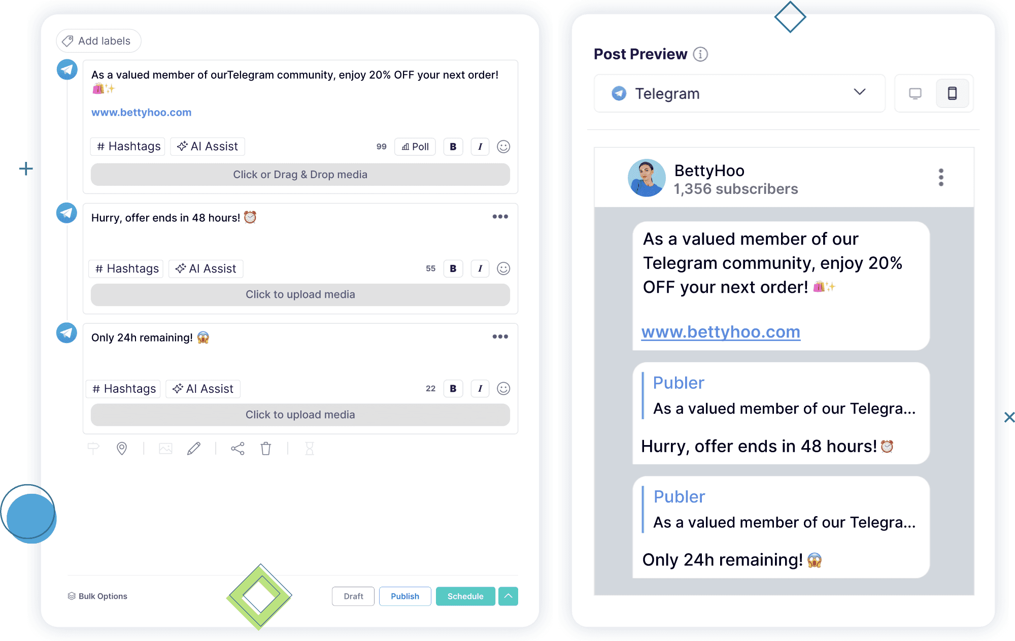 Use Publer as your Telegram scheduler to plan and send timed messages from desktop or mobile.