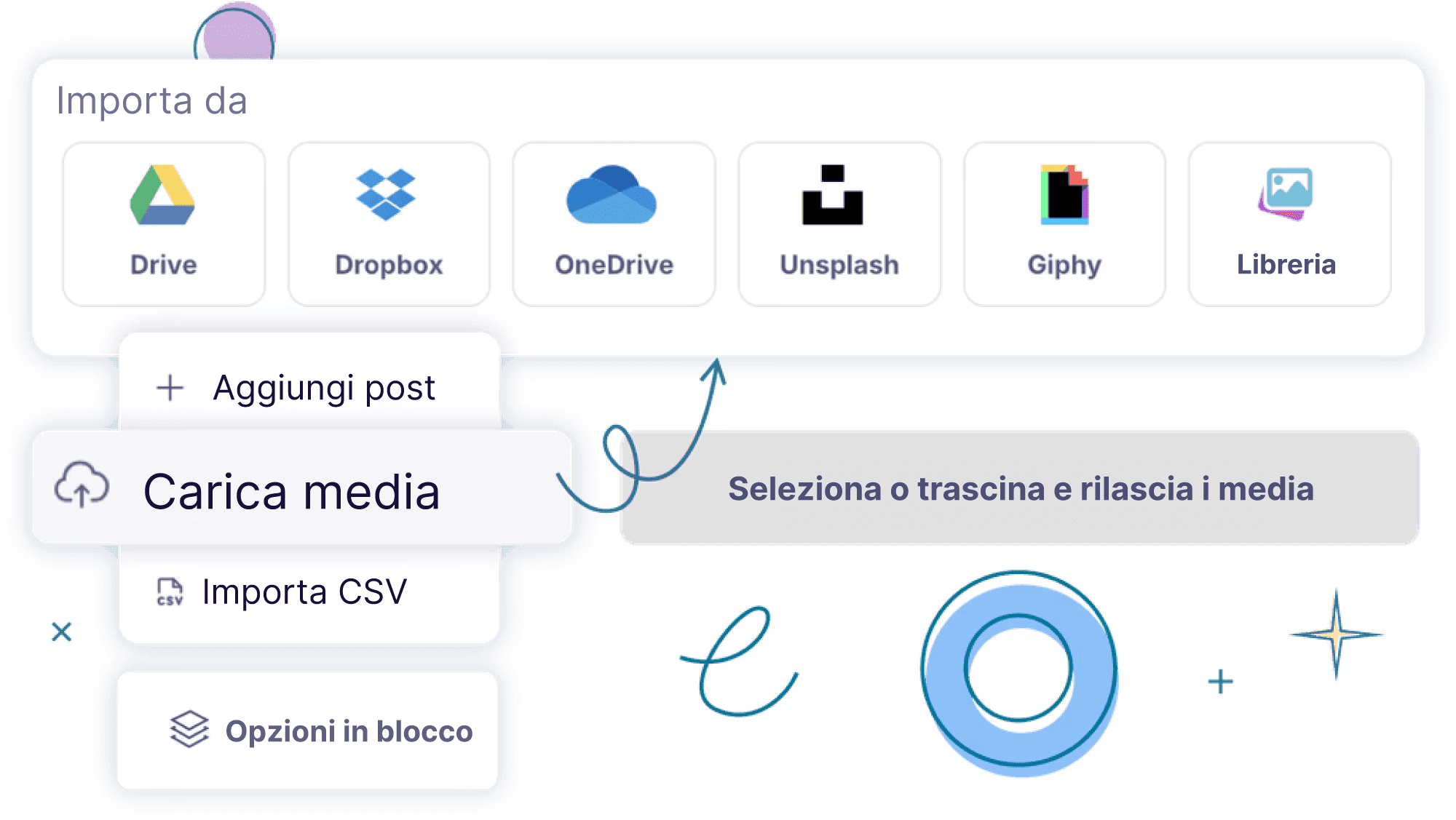 Si! Publer ti permette di caricare fino a 500 file multimediali contemporaneamente. Puoi trascinare e rilasciare i file o importarli da strumenti come Google Drive, Dropbox, OneDrive o Unsplash.