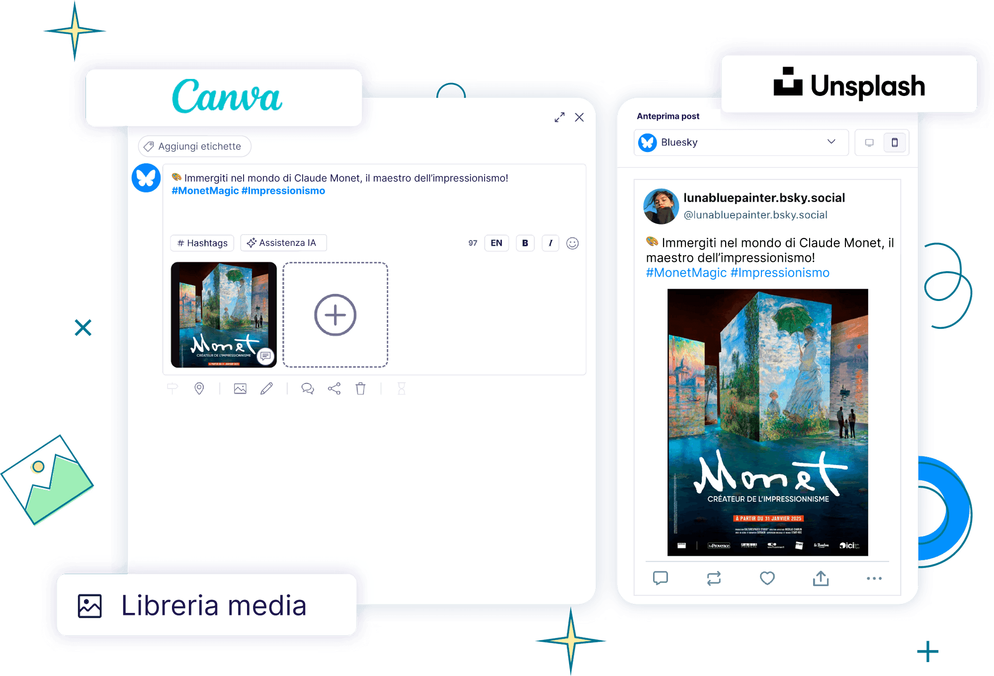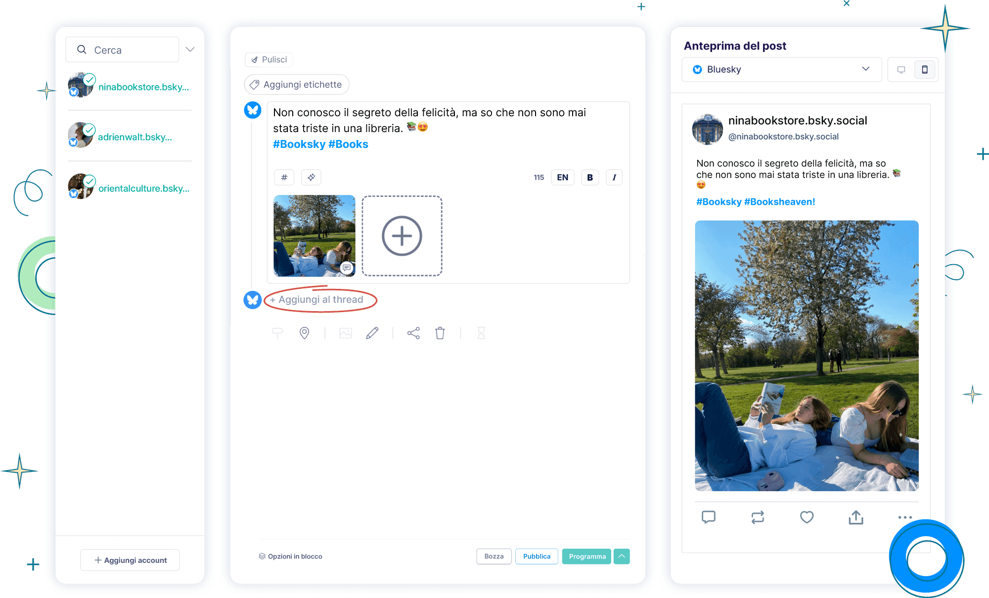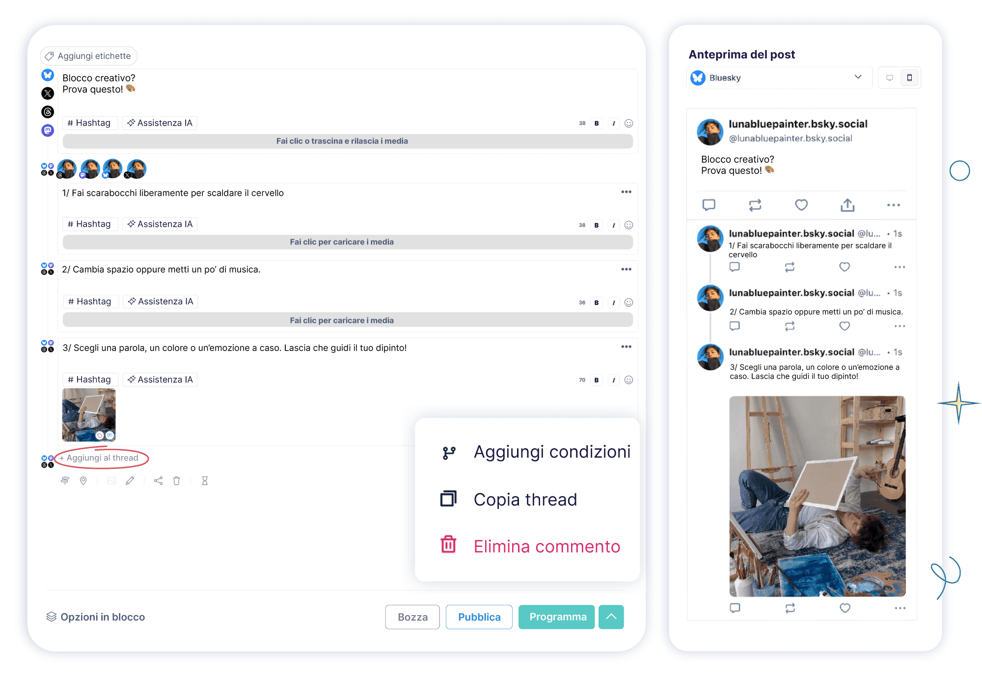 Pianifica, crea e programma facilmente post, thread e video su Bluesky.