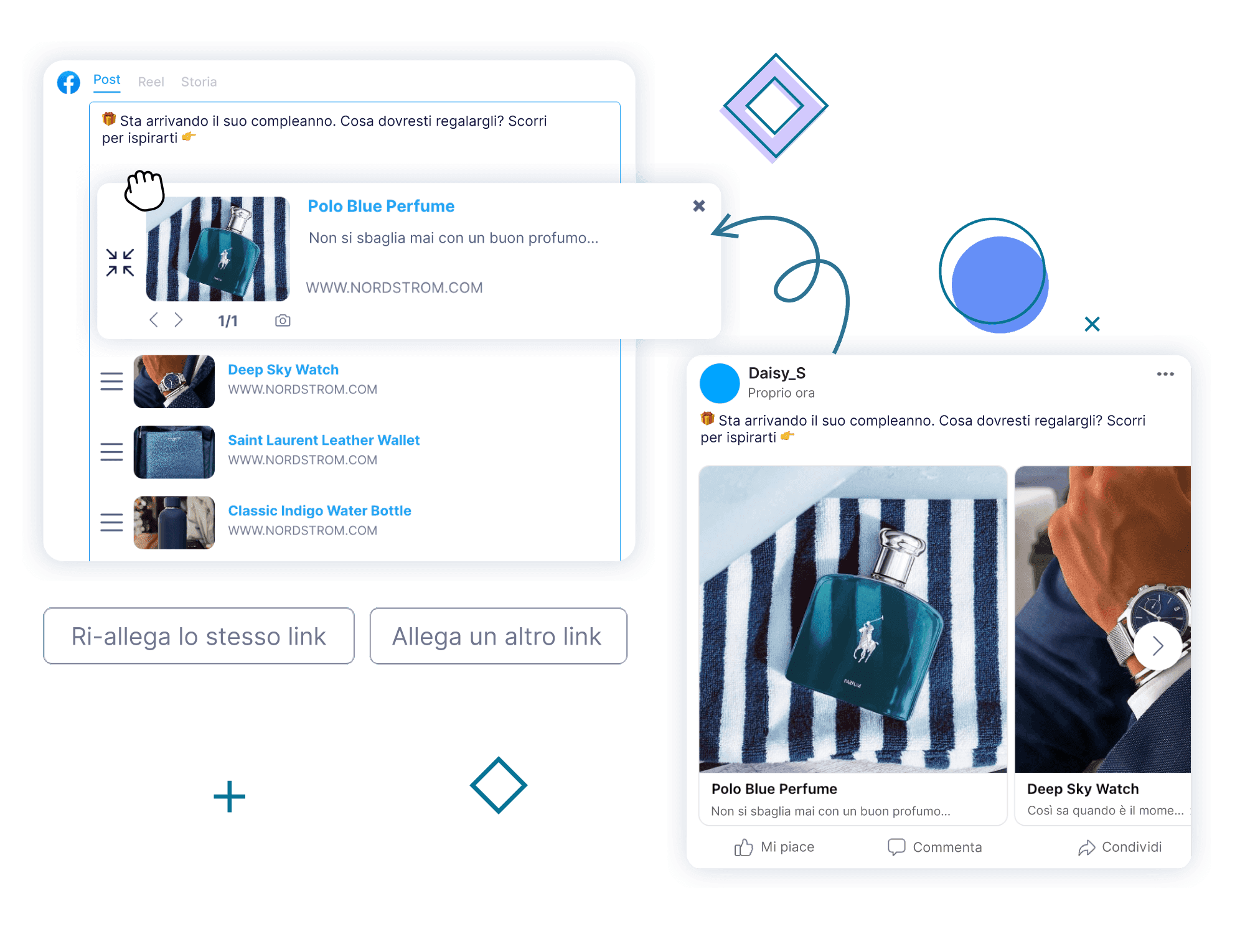 Converti di più programmando post a carosello su Facebook. Mostra i prodotti su Facebook, promuovi post del blog o racconta storie in un formato visivamente accattivante che porterà traffico al tuo sito web.