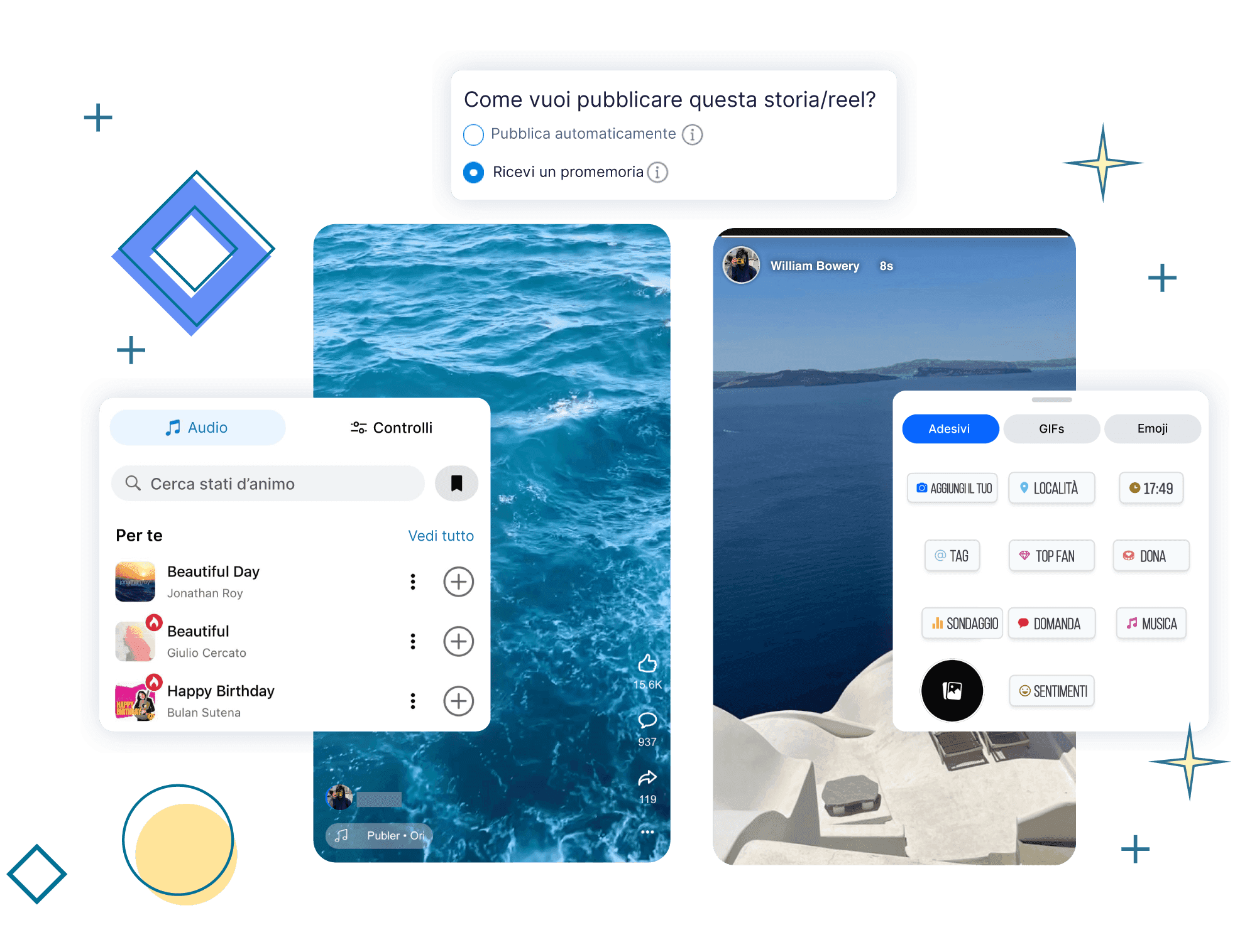 Espandi la tua portata programmando in anteprima i Reels di Facebook e mantieni il tuo pubblico attuale coinvolto grazie all'automatizzazione delle Storie di Facebook.