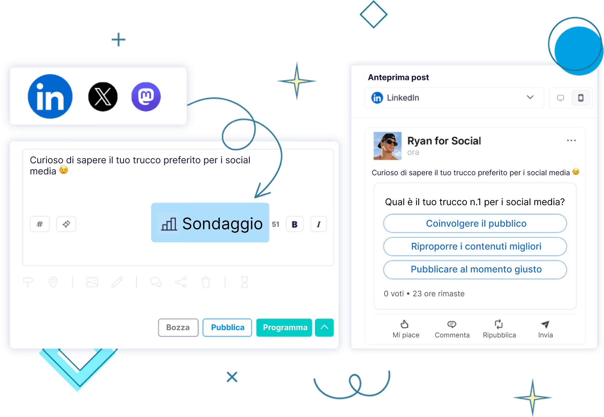 Crea e programma facilmente sondaggi su LinkedIn con Publer. Pianifica una volta e condividi senza problemi su X/Twitter e Mastodon.