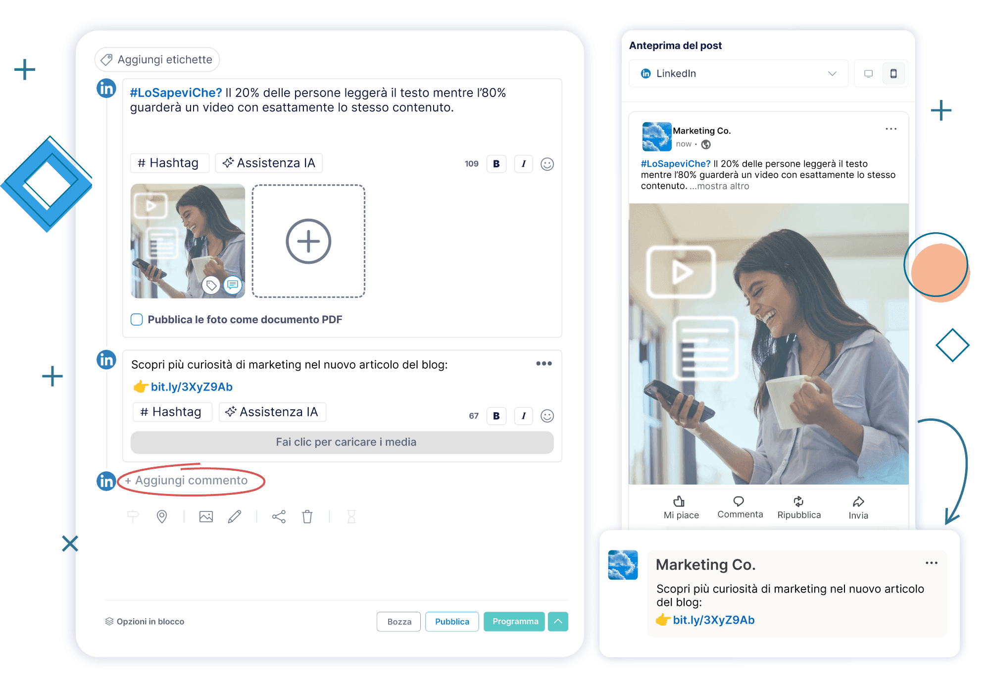 Aggiungi collegamenti, hashtag o mantieni fluide le conversazioni nei commenti programmando il primo commento sotto al tuo post.