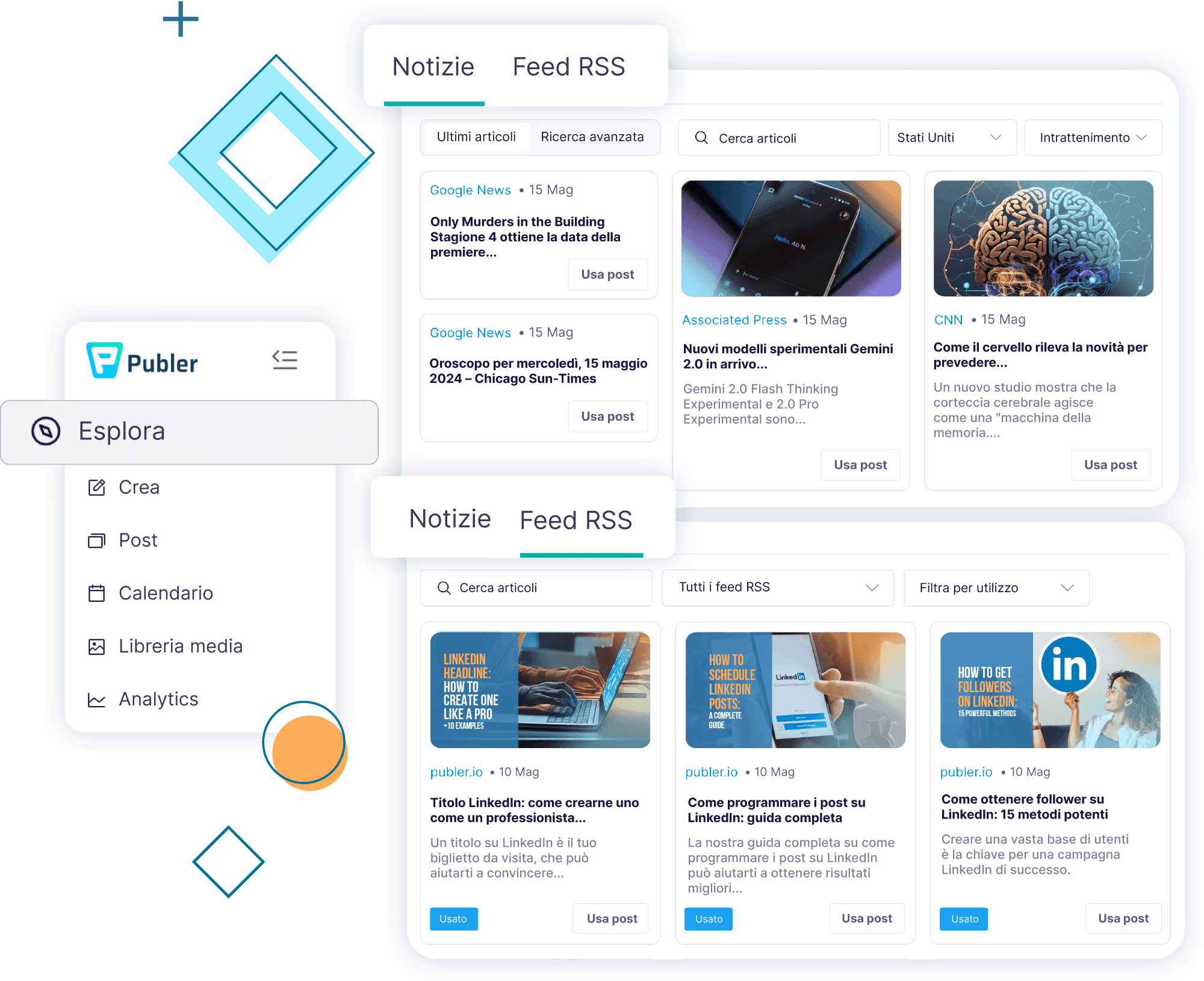 Trova e condividi le ultime notizie e articoli dettagliati realtivi al tuo settore con i feed RSS e la sezione Notizie di Publer.