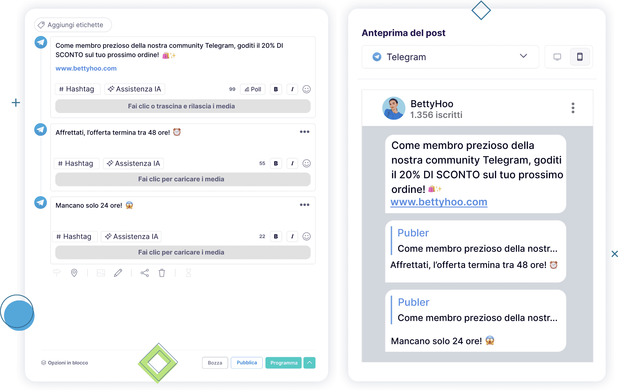 Usa Publer per programmare e inviare messaggi su Telegram, sia da desktop sia dal cellulare.