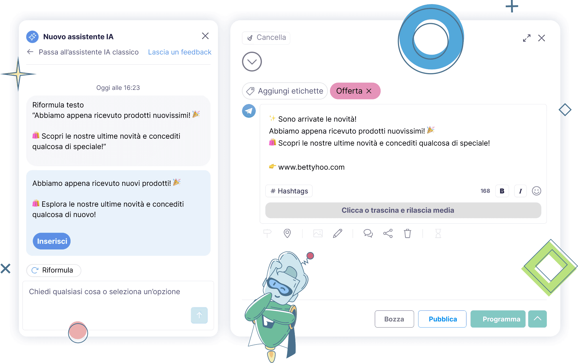 Genera post coinvolgenti su Telegram con l'IA in pochi secondi! Gli strumenti di Publer IA aiutano a creare contenuti, suggerire idee e personalizzare il tono e lo stile per adattarli al tuo brand.