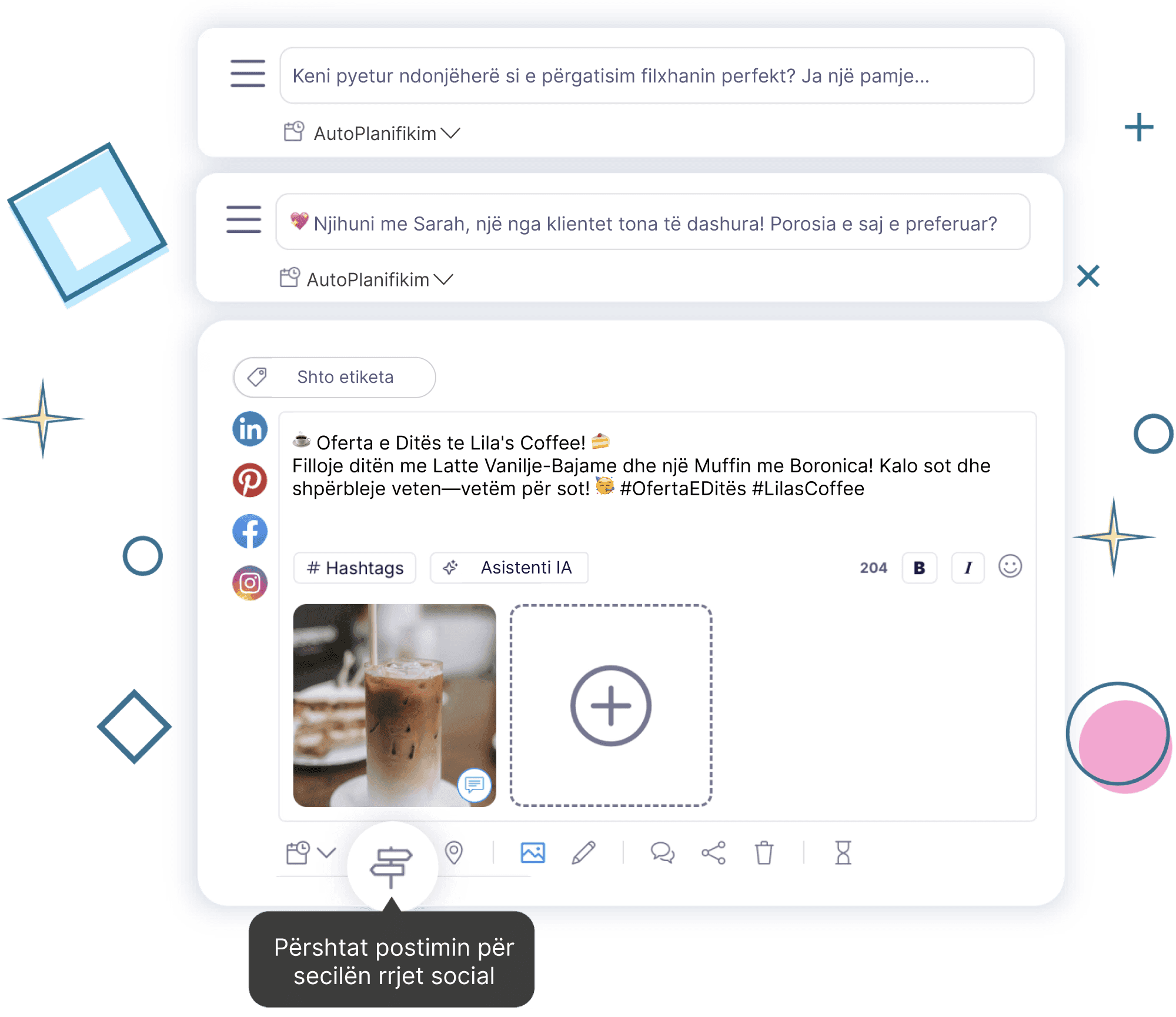 Shko përtej planifikimit bazik. Eksploro opsione shtesë nga Publer për të personalizuar përmbajtjen tënde, të kapësh një audiencë më të gjerë dhe të arrish rezultate më të larta.