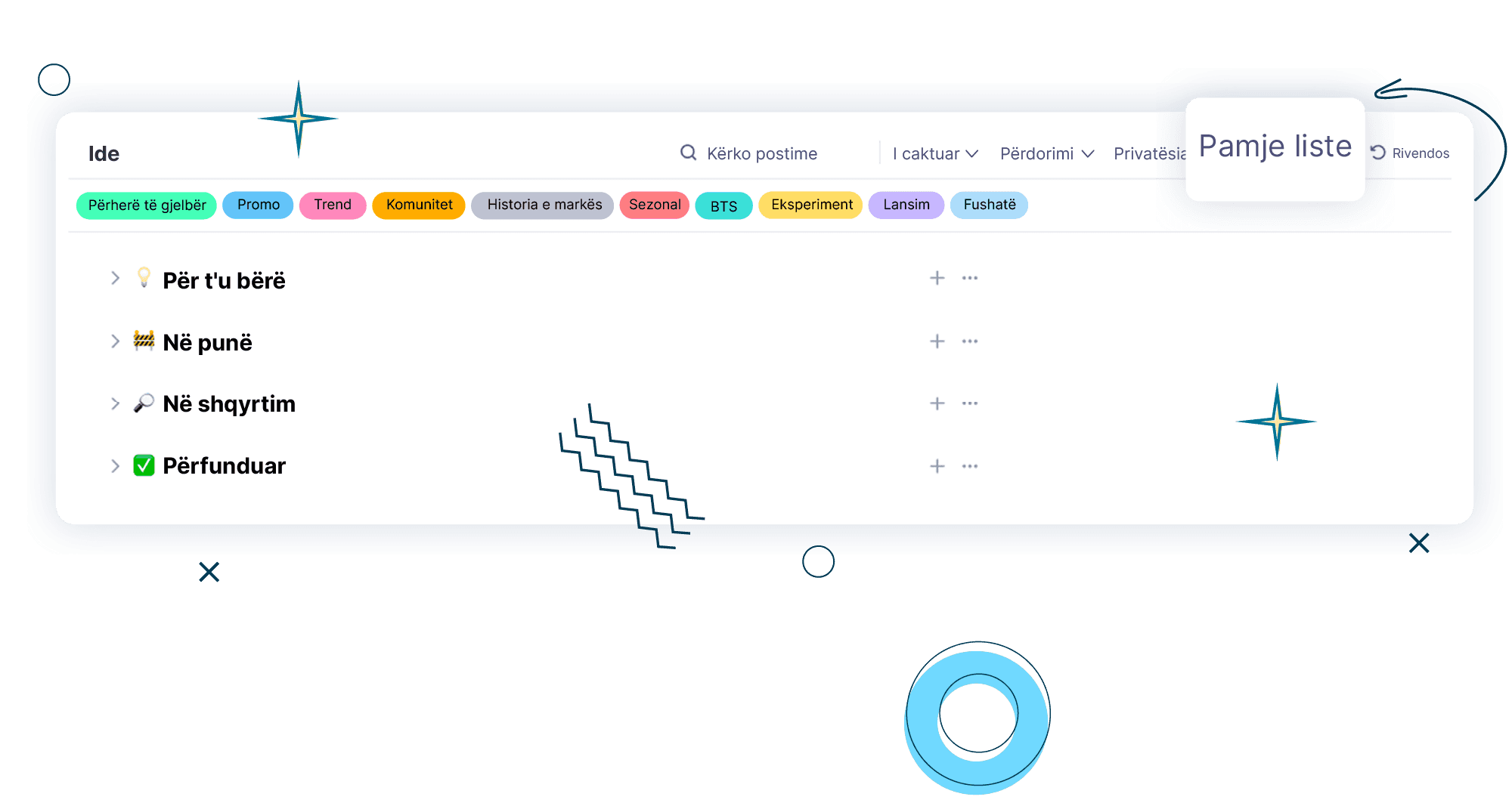 Shënimet dhe mjetet e detyrave nuk janë krijuar për planifikim dhe bashkëpunim të përmbajtjes. Publer Idetë kombinon strukturën, bashkëpunimin dhe qartësinë në një vend, në mënyrë që idetë të mos humbasin apo të shkëputen.