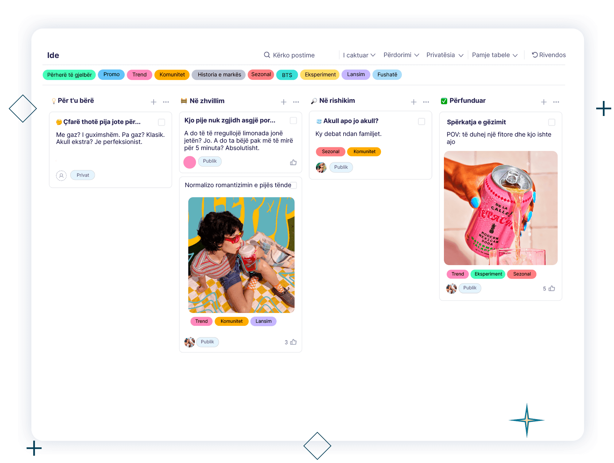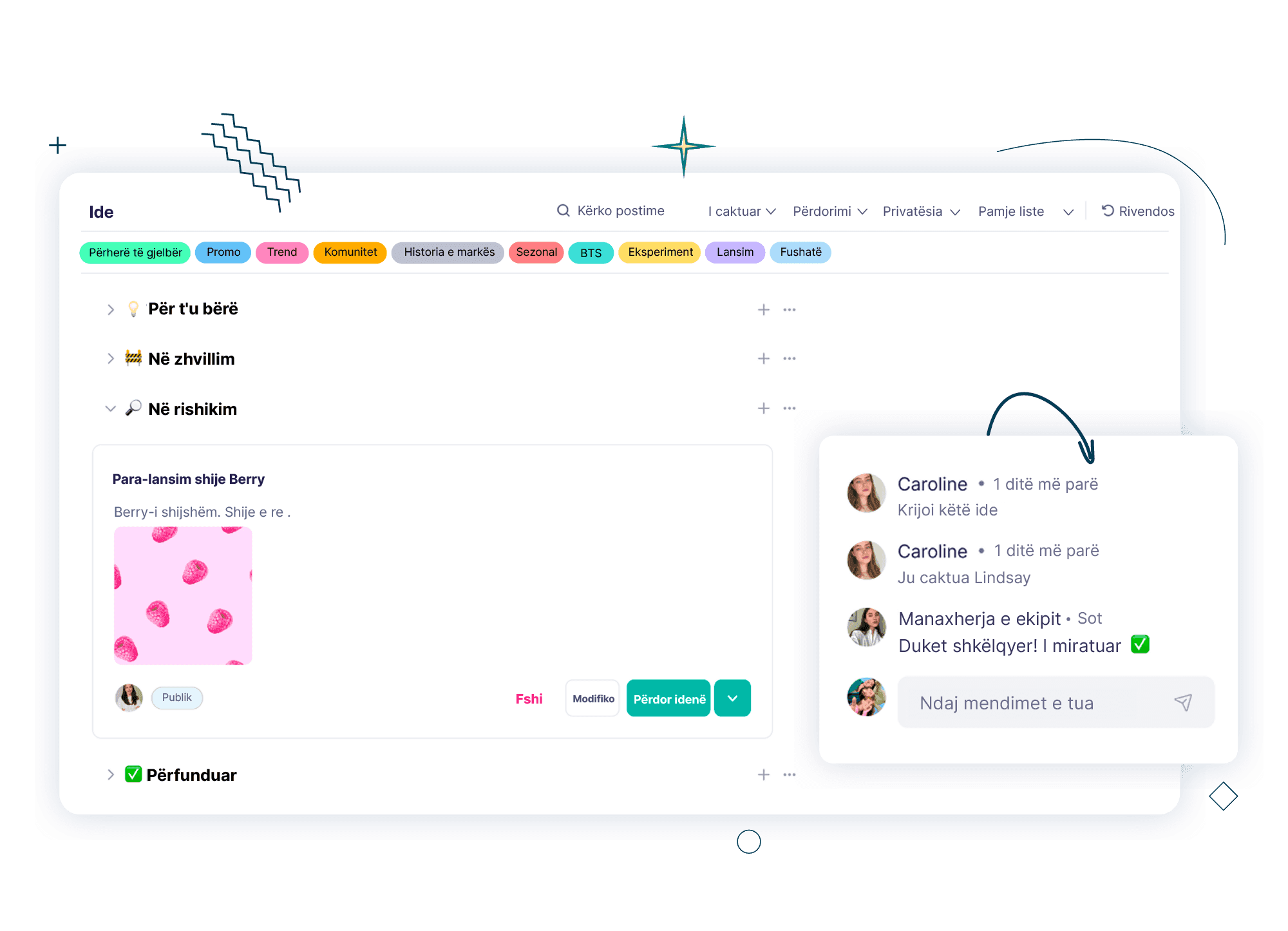 Po. Ju mund të caktoni ide, të lini shënime dhe të merrni miratime të qarta, duke e bërë të lehtë planifikimin e përmbajtjes me kolegët ose klientët.