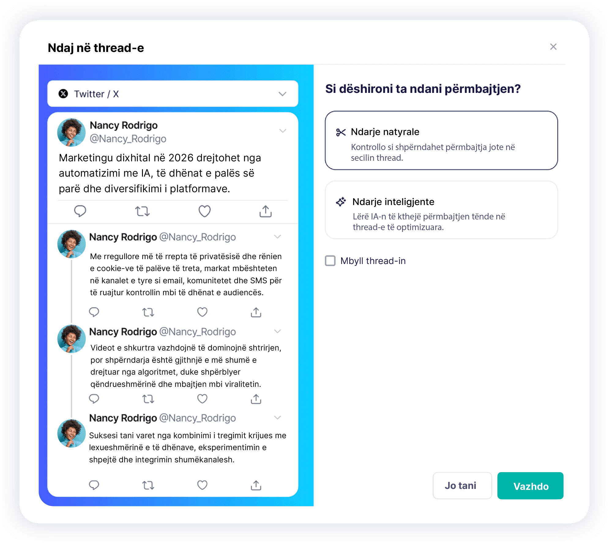Ju mund të krijoni dhe planifikoni threads për X (dikur Twitter), Threads, Mastodon dhe Bluesky, të gjitha nga një panel i vetëm.