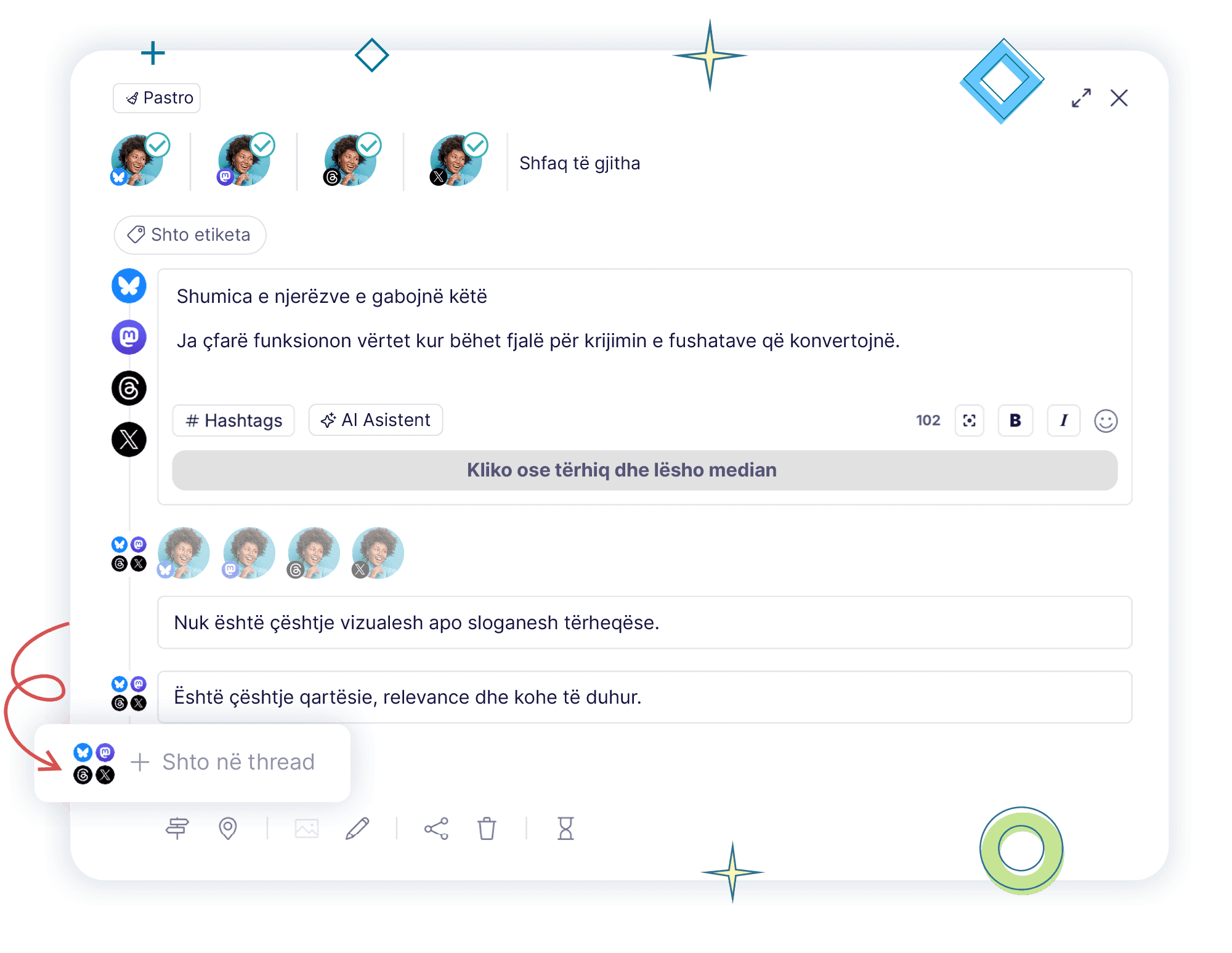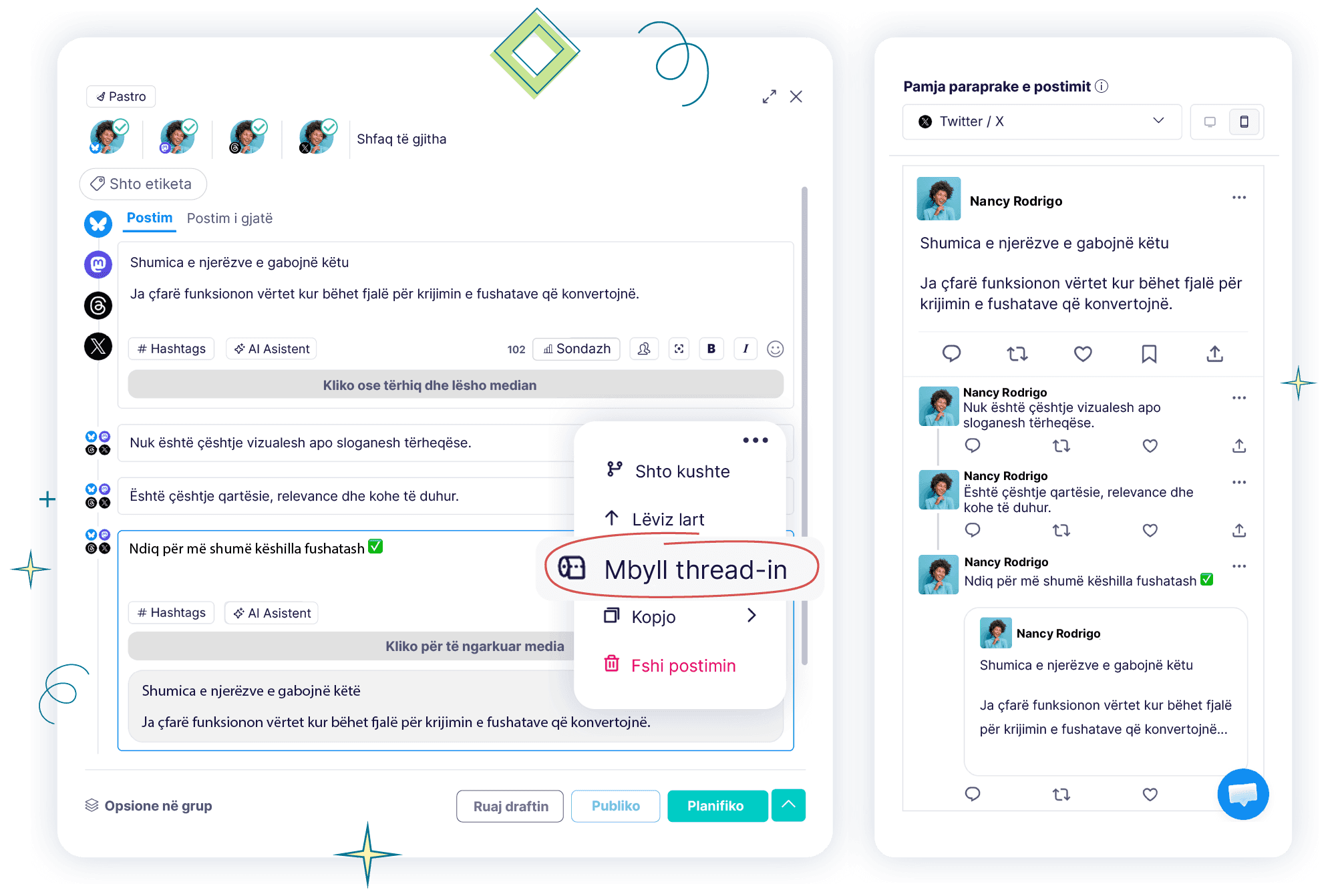 Shkruaji dhe planifikoji postimet e ndara në X/Twitter, Threads, Mastodon dhe Bluesky.