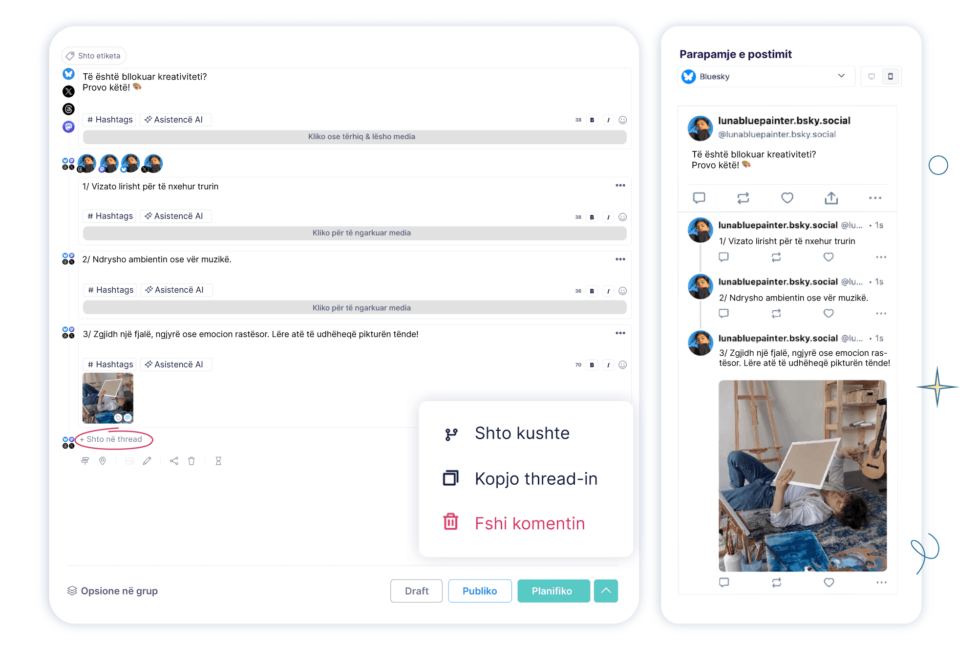 Planifiko, krijo dhe organizo postime, threads dhe video lehtësisht në Bluesky.