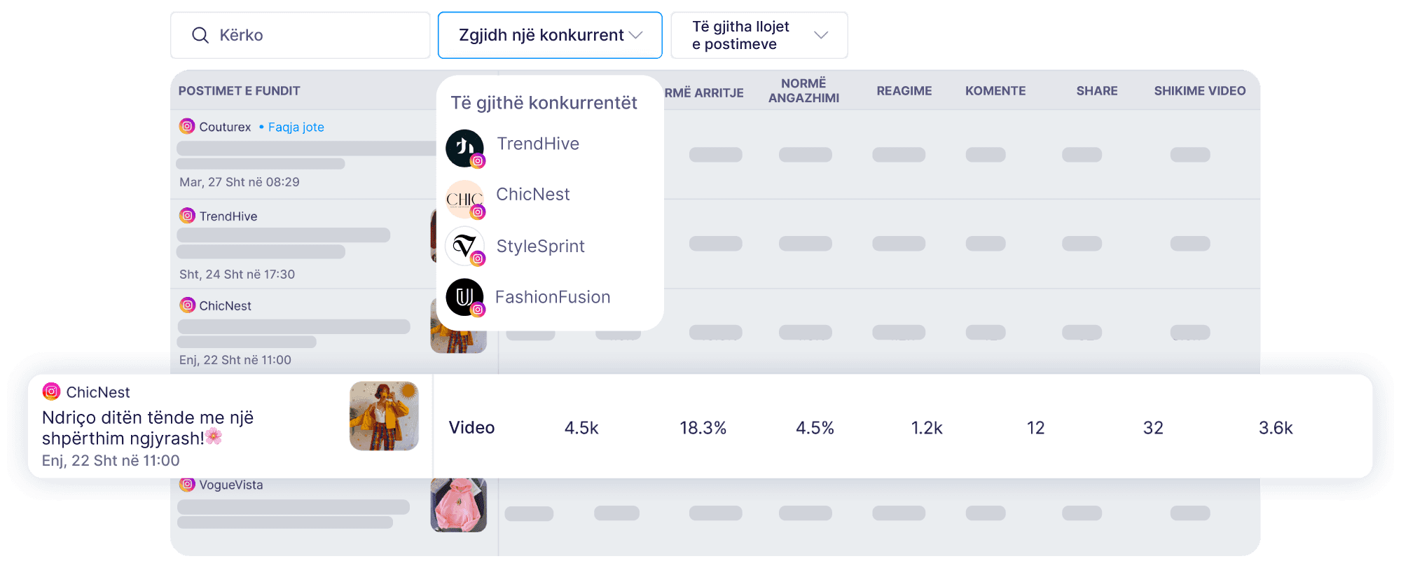 Gjurmo përmbajtjen më të mirë të konkurrentëve në Instagram, hashtag-et, strategjinë, taktikat e rritjes dhe orët e pikut të postimeve.
