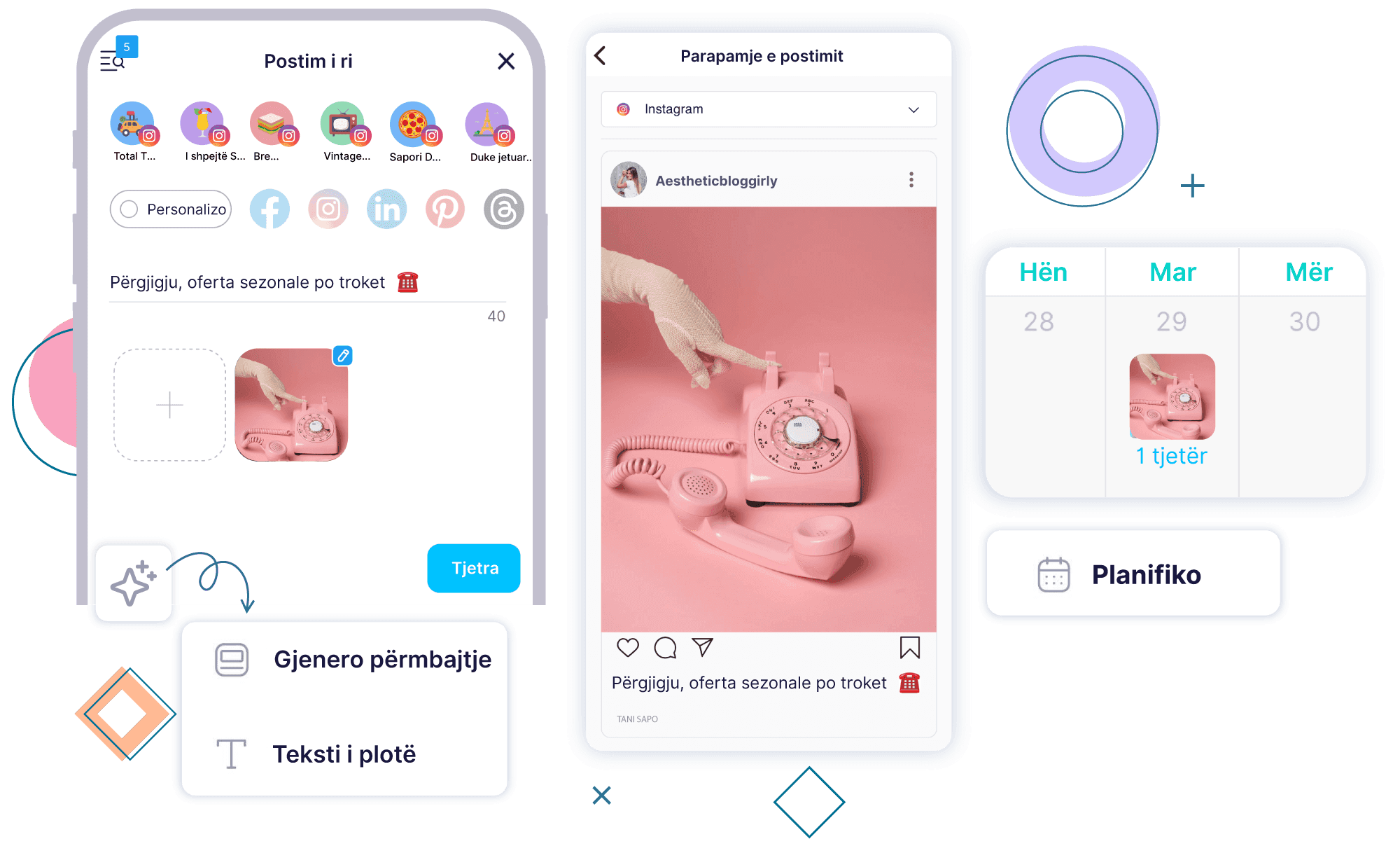 Po! Publer të lejon të planifikosh postime për Instagram dhe Facebook njëkohësisht. Mund të personalizosh postimet për secilën platformë për të optimizuar angazhimin. Mund të planifikosh edhe për 10 rrjete të tjera sociale!