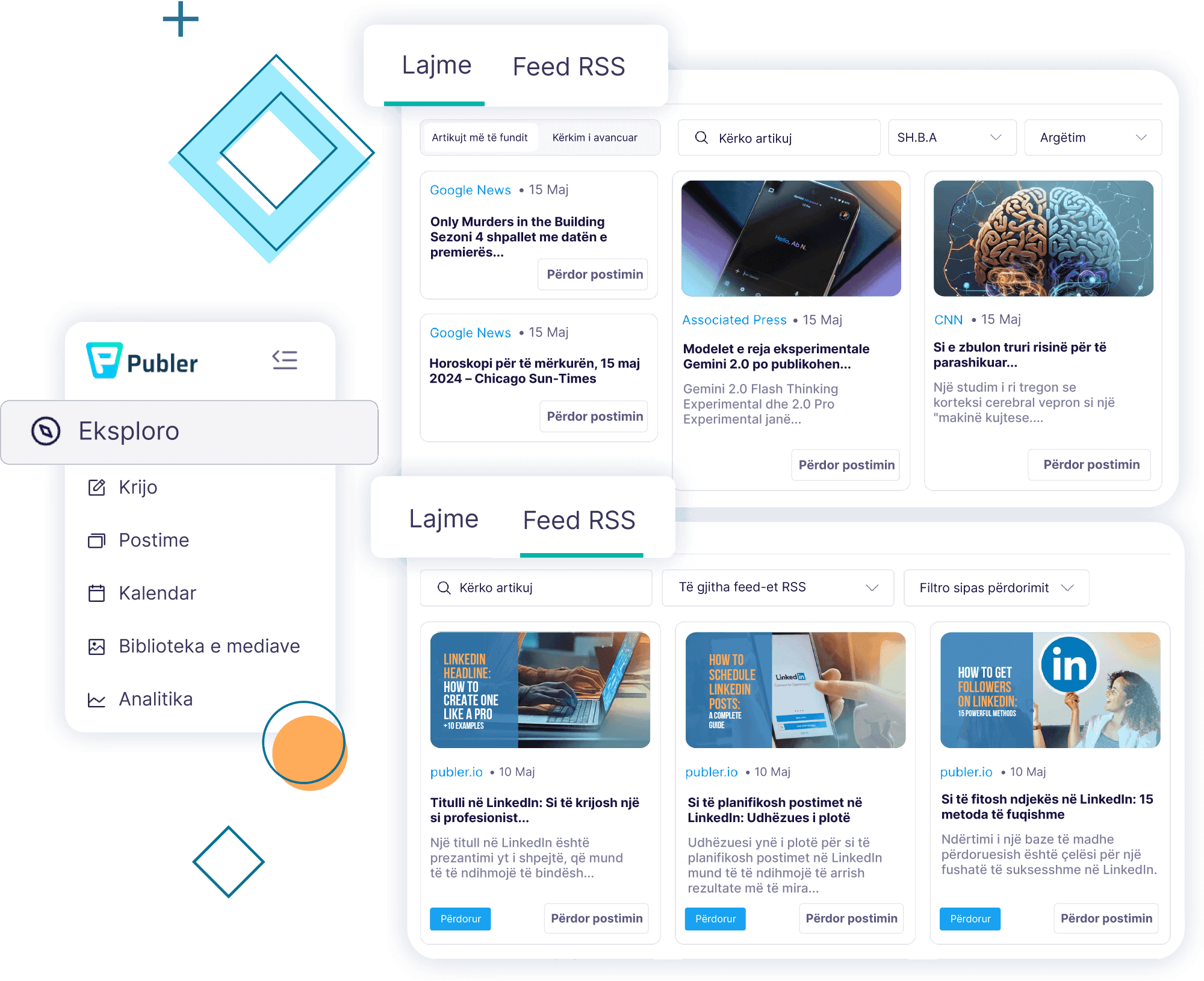 Gjej dhe ndaj lajmet më të fundit dhe artikujt më interesantë rreth fushës tënde me RSS Feeds dhe seksionin e lajmeve të Publer.