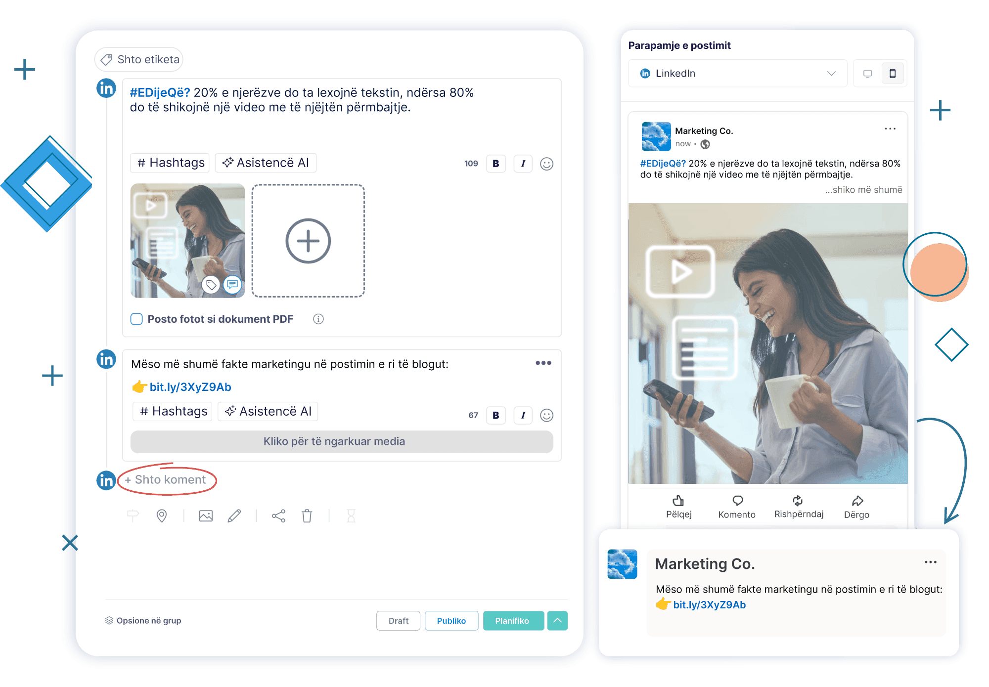 Shto link-e, hashtag-e, ose mbaje bisedën të ndezur automatikisht në komente duke planifikuar komentin e parë në postimin tënd.
