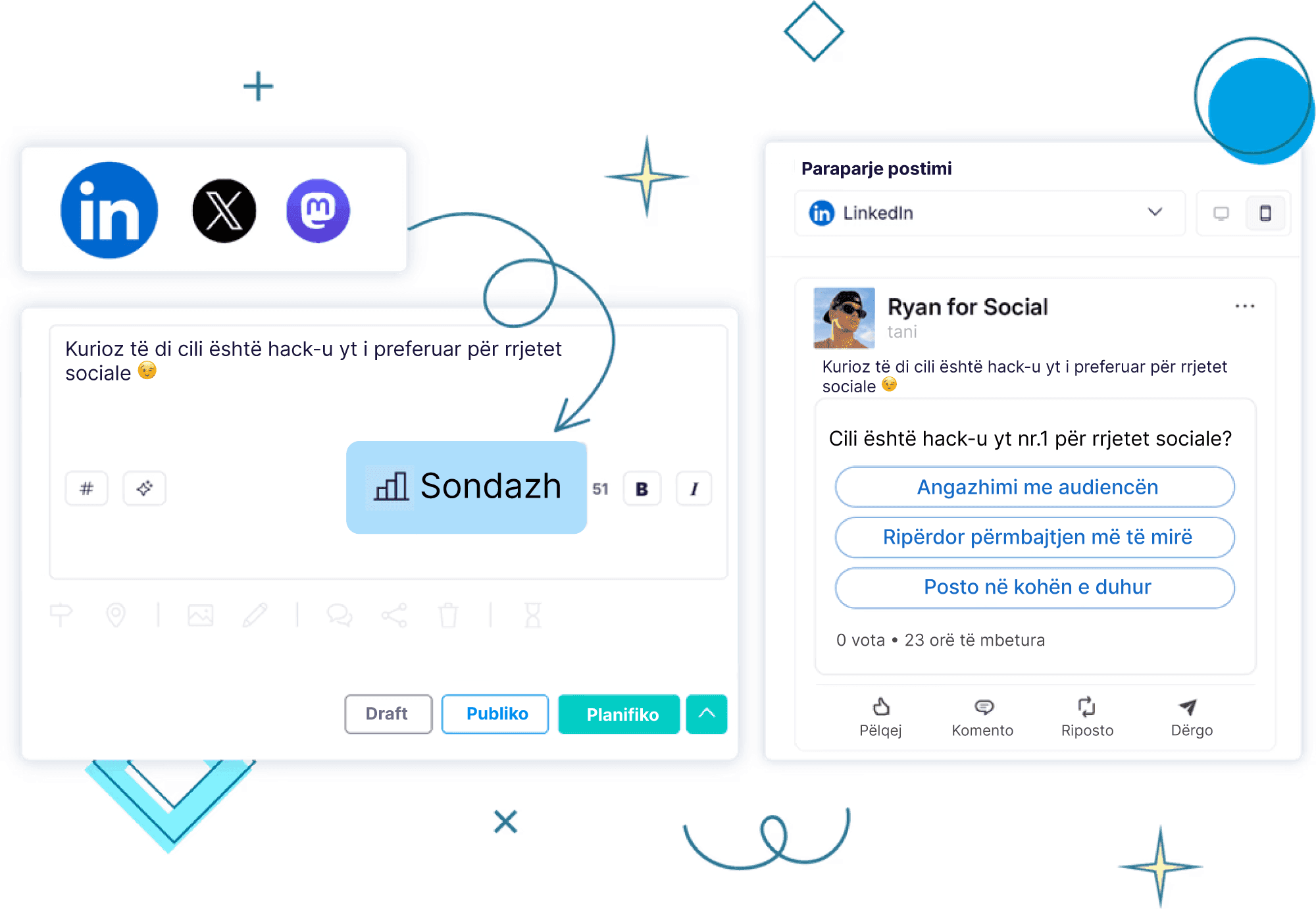 Krijo dhe planifiko sondazhe për LinkedIn me Publer. Planifiko një herë dhe ndaje fare thjesht edhe në X/Twitter apo Mastodon.