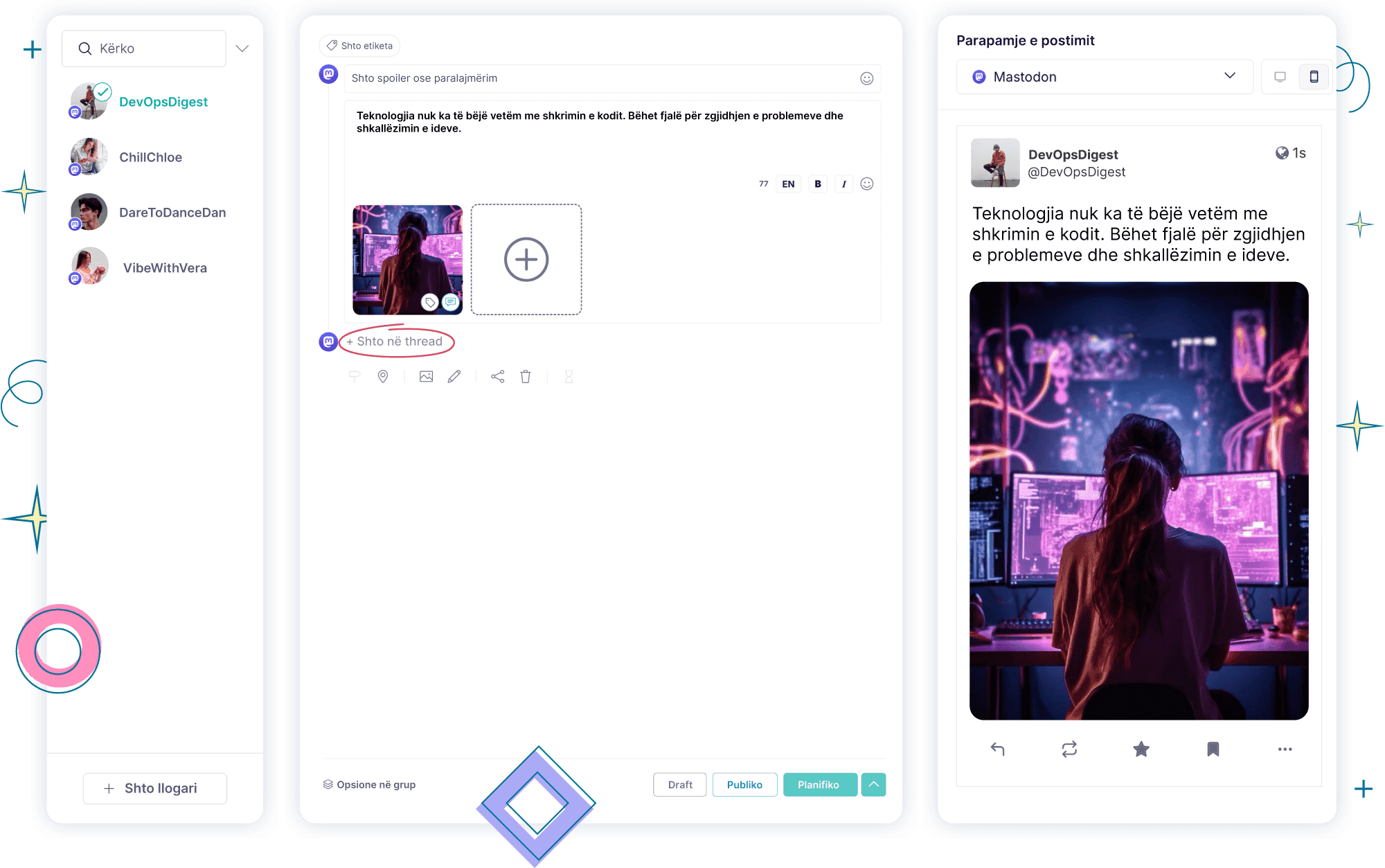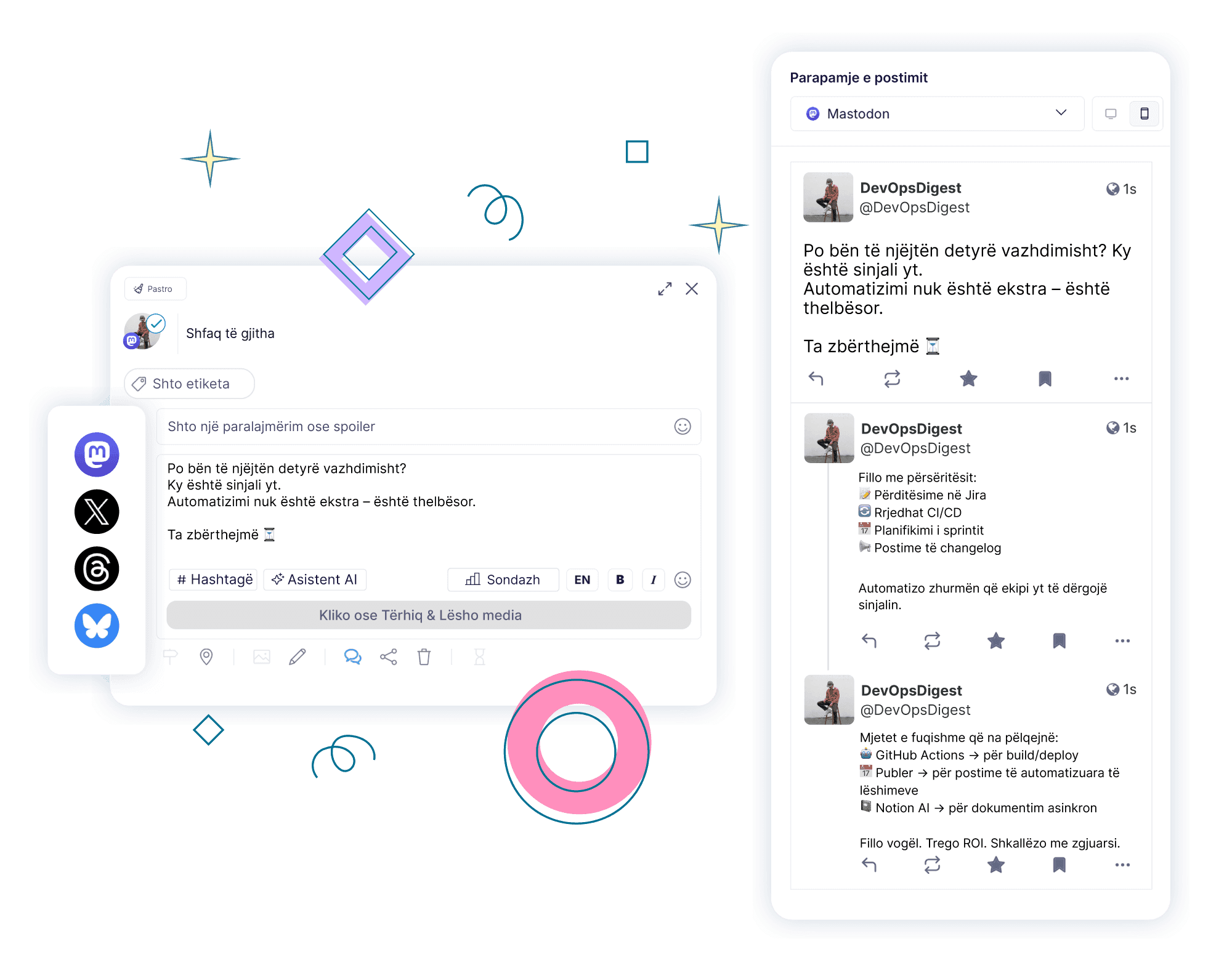 Nga vizualet deri tek hashtag-ët për Mastodon, Publer siguron që përmbajtja jote të ketë një impakt në këtë platformë të decentralizuar të social media.